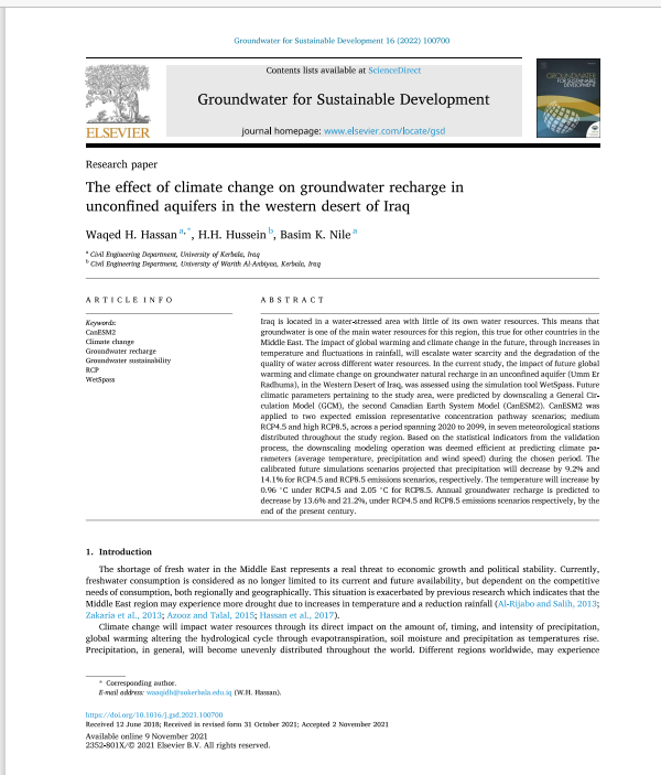 والذي نشر في المجلة العالمية (Groundwater for Sustainable Development) التابعة لدار النشر العالمية( السفير) و المفهرسة ضمن مستوعبات سكوبس وتقع ضمن مجلات الربع الاول Q1 ولها معامل تاثير مقداره 7.1، حيث تناول البحث دراسة تاثير التغيرات المناخية على التغذية الطبيعية للمياه الجوفية في منطقة الصحراء الغربية العراقية والتي تمثل الخزان الجوفي الغير محصور لتكوين ام رضمة، إذ تم تصغير (Downscaling) أحد أهم الموديلات العالمية الخاصة بالتنبؤ بالتغييرات المناخية العالمية على منطقة الدراسة باستخدام نموذج (SDSM) وتحت تاثير أهم السيناريوهات العالمية المتوقعة لزيادة انبعاث الغازات الدفيئة والمسببة للاحتباس الحراري خلال السنوات القادمة … تمت معايرة النتائج مع البيانات التاريخية لسبعة محطات ارصاد جوية في المنطقة ولفترة ٣٠ سنة".