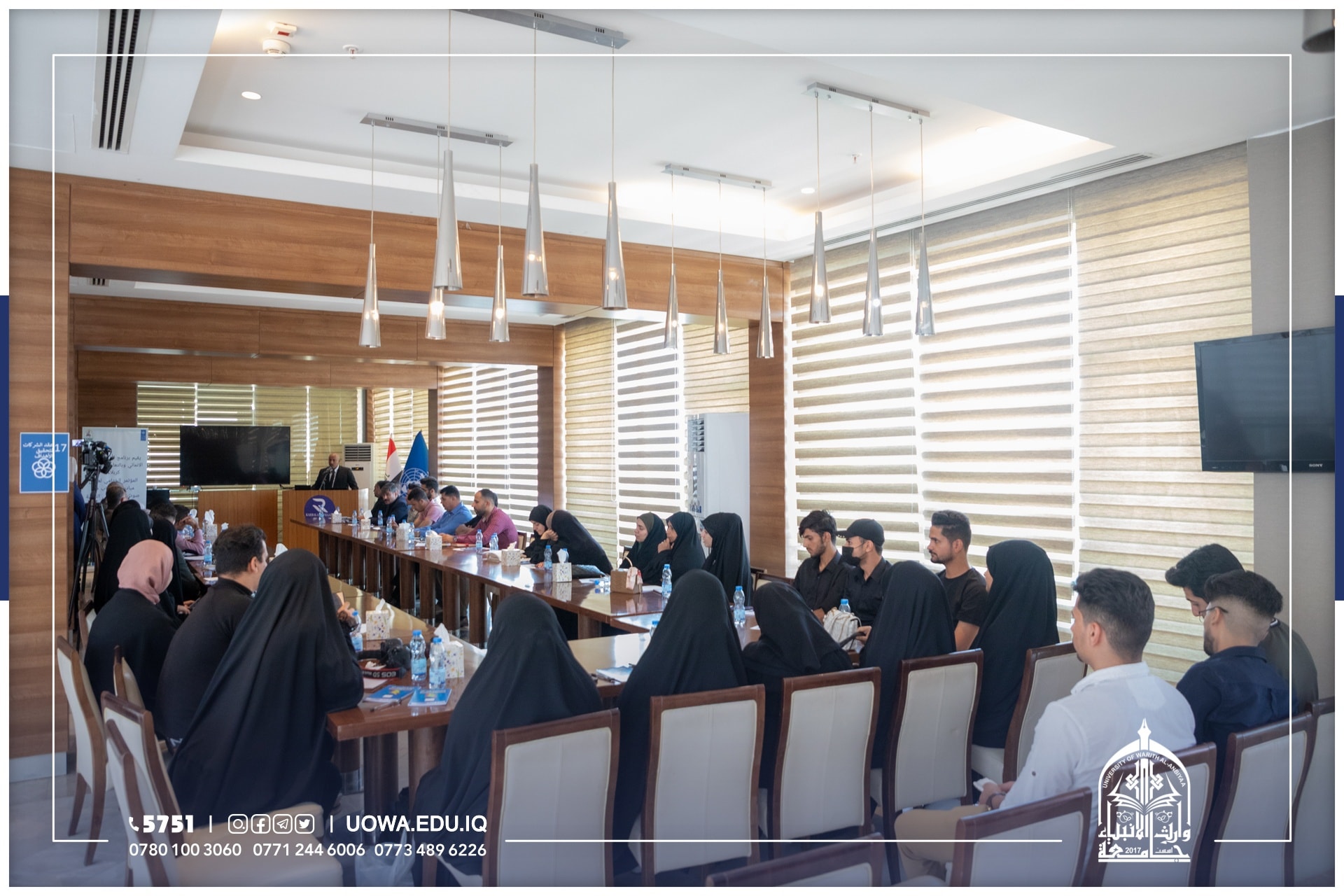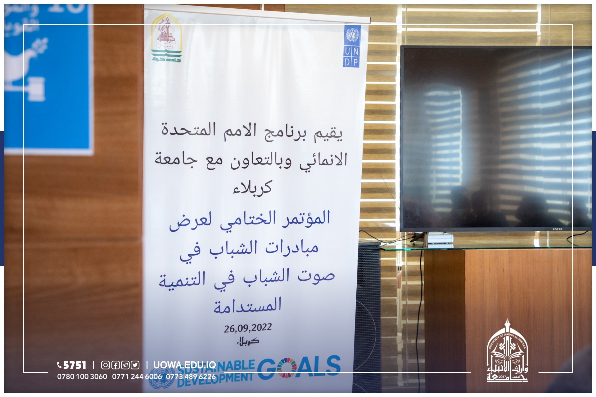 شارك طلبة جامعة وارث الانبياء(عليه السلام) بحضور المساعد العلمي الاستاذ الدكتور عباس الدعمي ومحافظ كربلاء المهندس نصيف جاسم الخطابي، ورئيس جامعة كربلاء الاستاذ الدكتور باسم السعيدي، في "المؤتمر الختامي لعرض مبادرات الشباب في التنمية المستدامة" الذي اقامه البرنامج الانمائي للامم المتحدة.