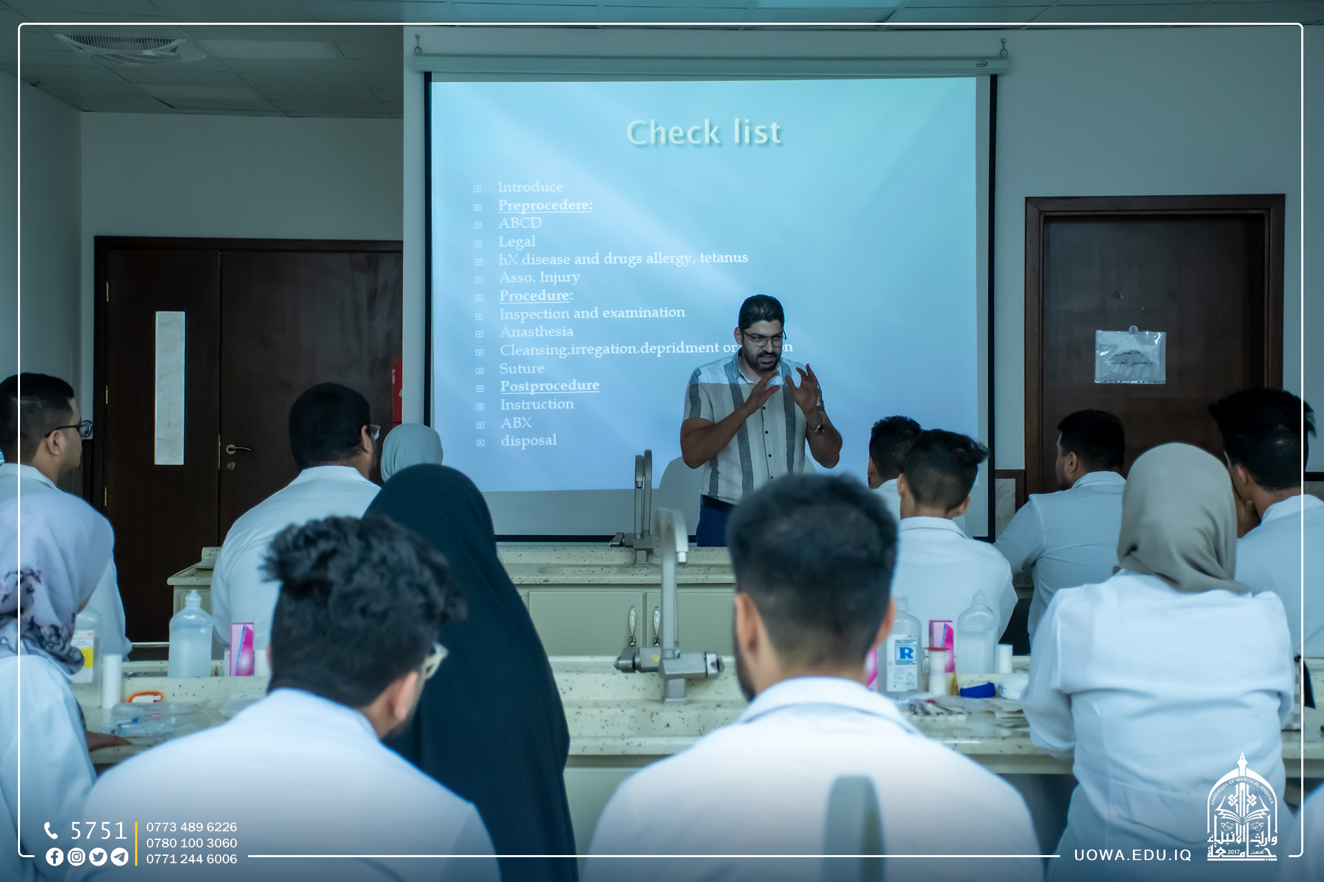 التقطت عدسة أعلام جامعة وارث الأنبياء (عليه السلام) لليوم الثاني على التوالي صورا لطلبة كلية الطب اثناء تدريبهم ضمن (الكورس التدريبي المكثف الأول) والذي استضافت فيه الجامعة عدد من الأطباء والمتخصصين, وذلك لتحسين الأداء وتعزيز المهارات الطبية.