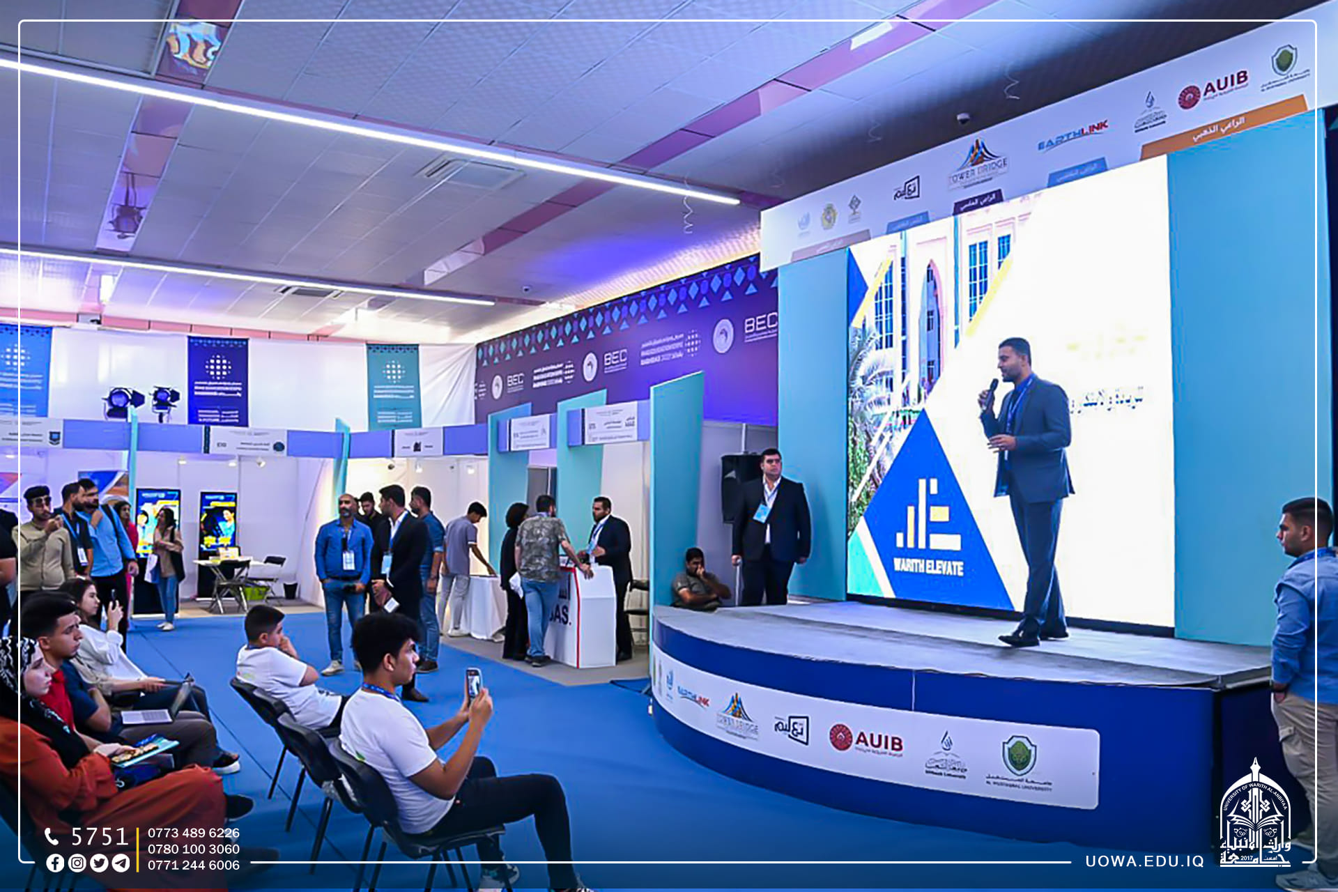 يواصل جناح جامعة وارث الانبياء بالمشاركة في تقديم العديد من الفعاليات العلمية والأكاديمية ضمن " مؤتمر ومعرض العراق للتعليم" حيث قدم فريق Warith Elevate شرحاً عن خدمات المركز لخريجي وطلبة الجامعة وكيفية المساهمة في تأهيلهم وتدريبهم لتهيئتهم للإنخراط في سوق العمل، وتوظيفهم ضمن مؤسسات العتبة الحسينية المقدسة بالإضافة الى دعم الجامعة "لمبادرة ريادة الحكومية" عبر إقامتها للدورات التدريبية في الجامعة.