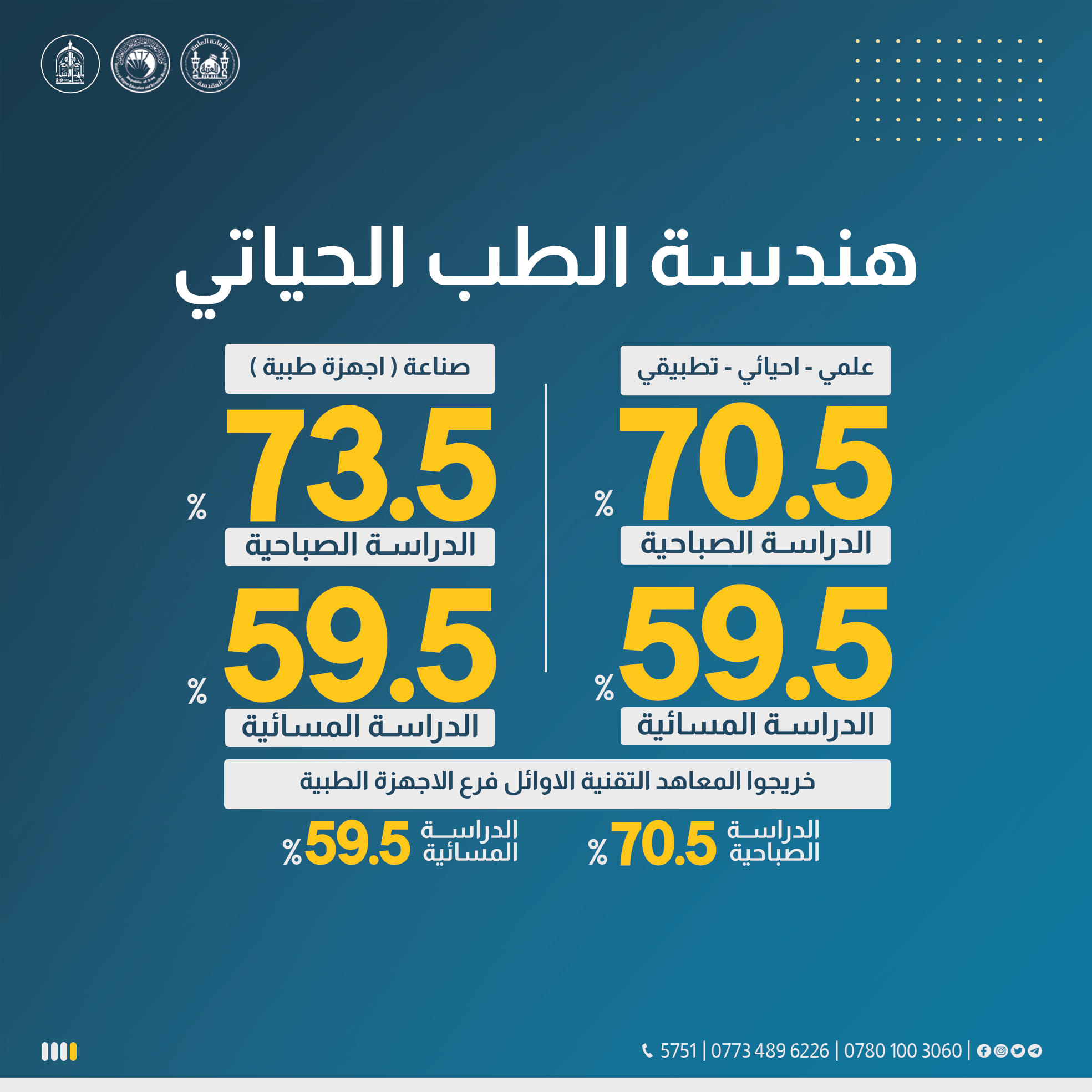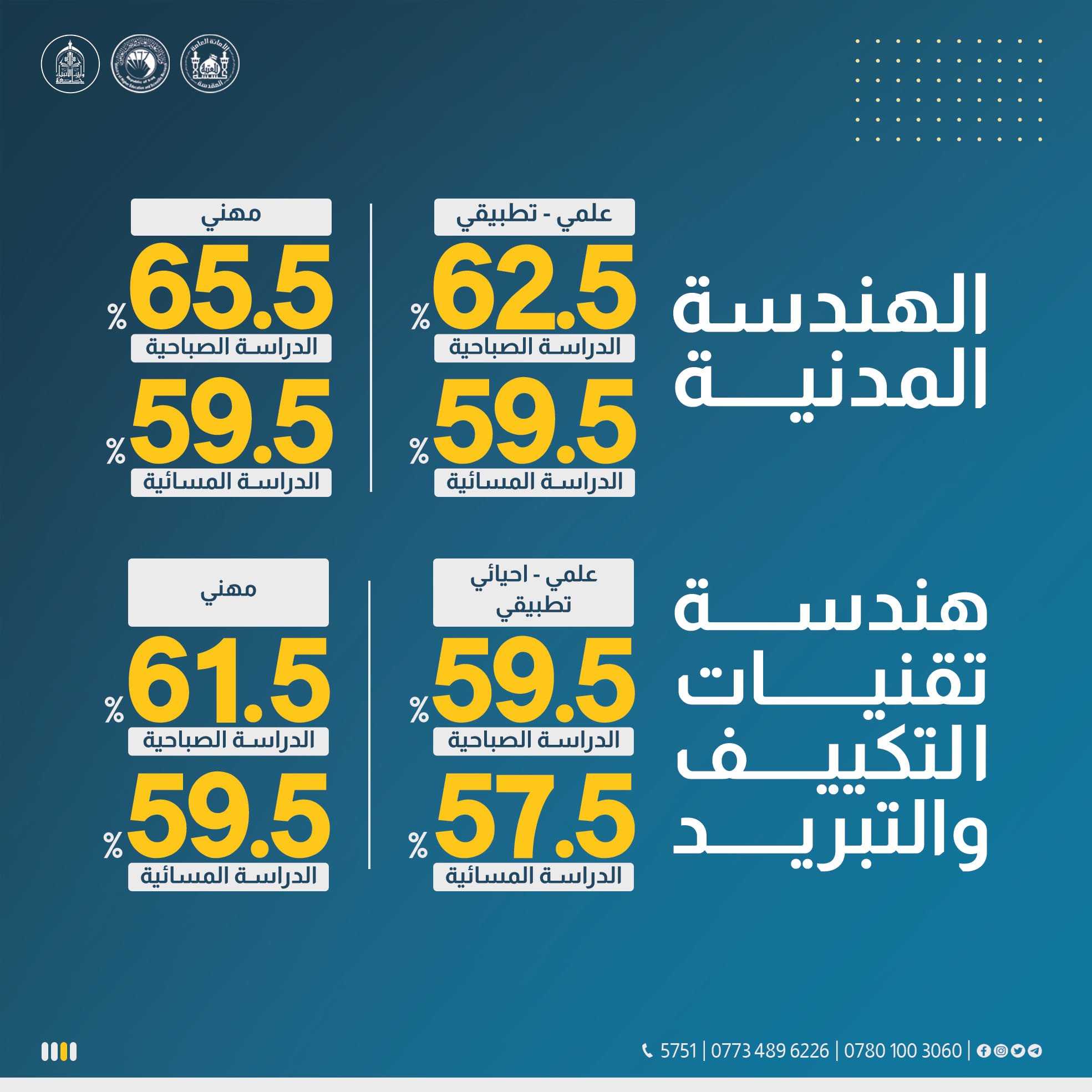 تخفيض الحدود الدنيا للقبول في الدراستين الصباحية والمسائية لتخصصات (الهندسة، التقنيات الهندسية، العلوم) التي معدلات التقديم الحالي فيها (61) صعودا بواقع (درجة واحدة) فقط.