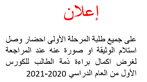 طلبتنا الأعزاء نود اعلامكم بأن جميع المحاضرات ستكون إلكترونية خلال الأسبوعين القادمين حسب توجيهات رئاسة الجامعة وحفاظا على سلامتكم، حفظ الله الجميع انه سميع مجيب.