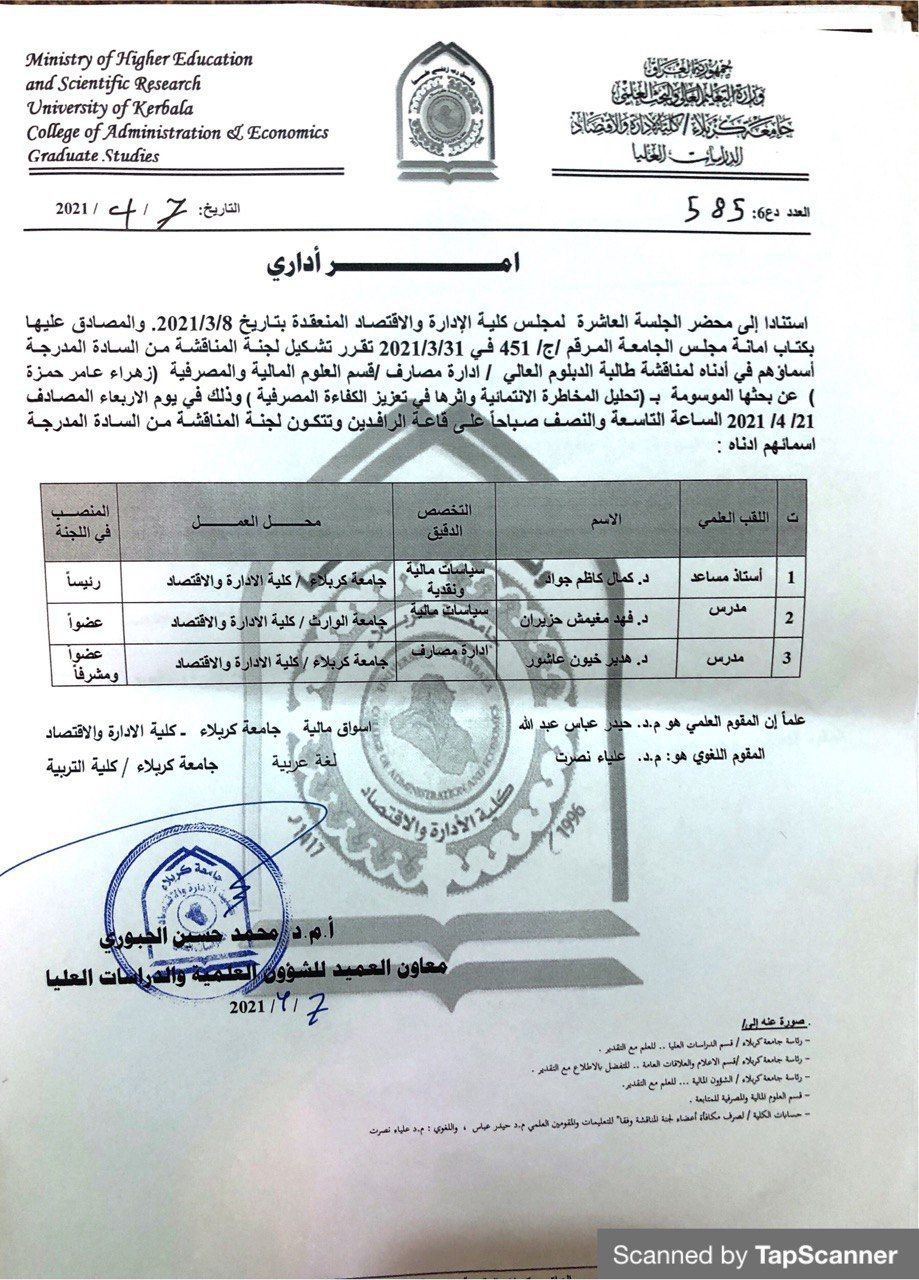 شارك الدكتور (فهد مغيمش الشمري) التدريسي في كلية الادارة والاقتصاد/جامعة وارث الانبياء (ع) بصفته عضواً في مناقشة طالبة الدبلوم العالي (زهراء عامر حمزة) من جامعة كربلاء/كلية الادارة والاقتصاد/ قسم العلوم المالية والمصرفية عن بحثها الموسومة (تحليل المخاطرة الانتمائية واثرها في تعزيز الكفاءة المصرفية) وذلك في يوم الاربعاء المصادف 21/4/2021.