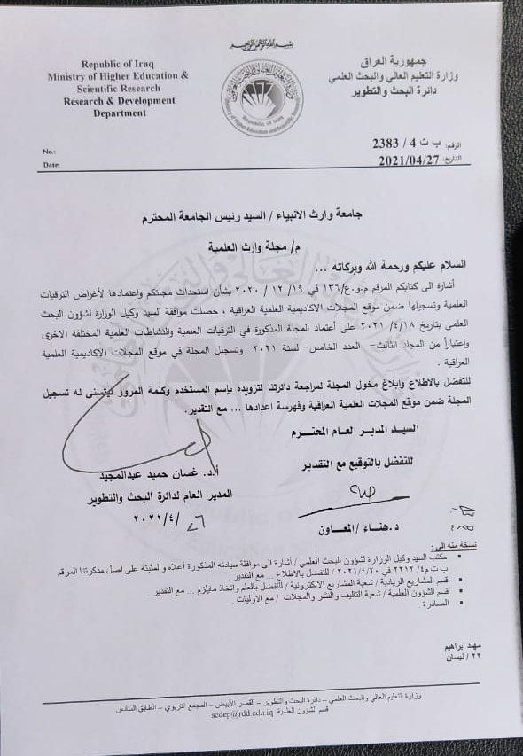 حصلت مجلة وارث العلمية موافقة وزارة التعليم العالي والبحث العلمي العراقية، وتسجيلها ضمن موقع المجلات الاكاديمية العلمية العراقية واعتمادها في الترقيات والنشاطات العلمية المختلفة.