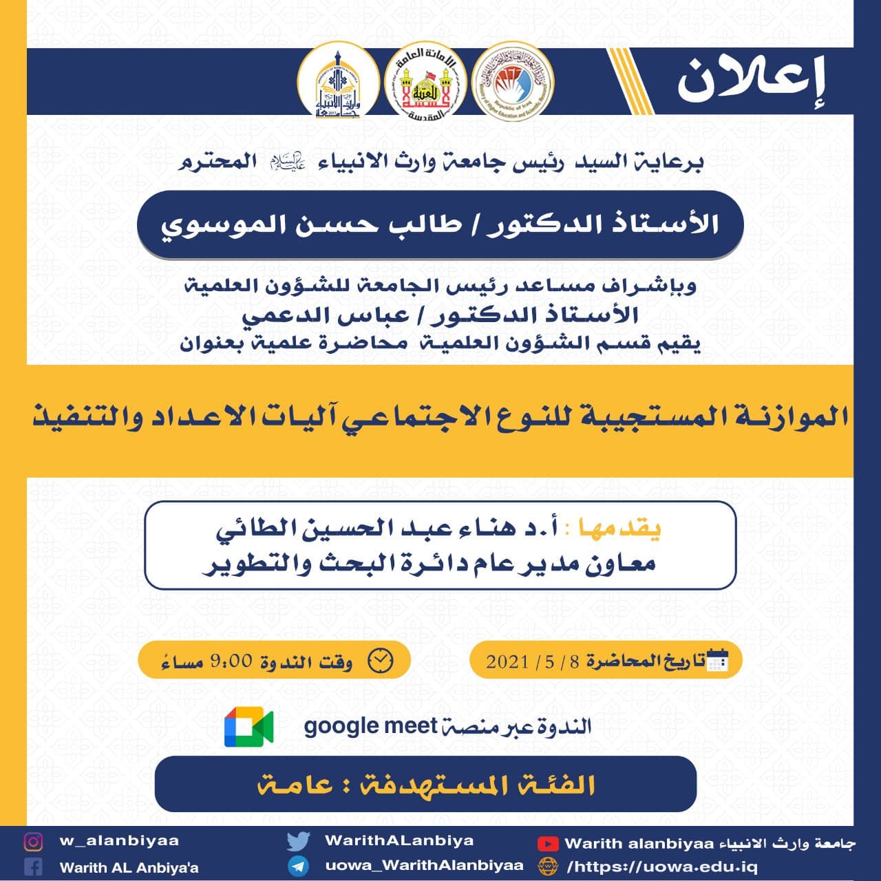 في ضوء سلسلة الندوات العلمية بجامعة وارث الأنبياء يقيم قسم الشؤون العلمية بالجامعة وبالتعاون مع كلية الادارة والاقتصاد الندوة الالكترونية الاسبوعية ( الموازنة المستجيبة النوع الاجتماعي / آليات الإعداد والتنفيذ) تلقيها الدكتورة ( ا.د. هناء عبد الحسين الطائي، معاون مدير دائرة البحث والتطوير في وزارة التعليم العالي والبحث العلمي).. والتي القيت في يوم السبت المصادف 8/5/2021 عبر منصة الكوكل ميت