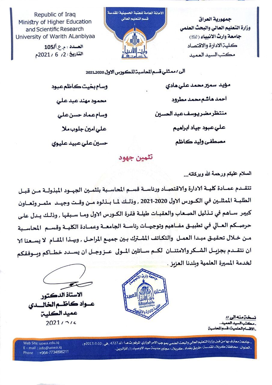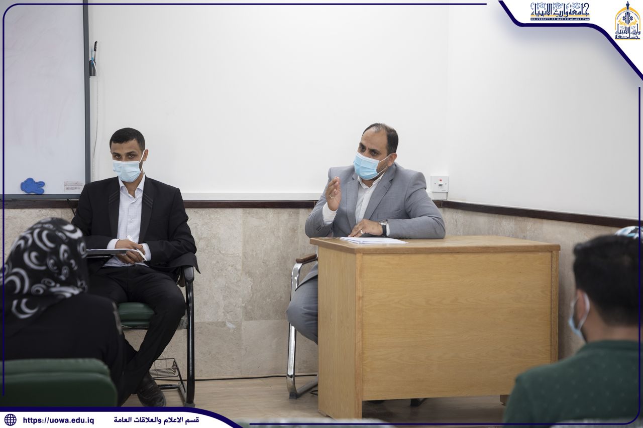 اجتمع السيد عميد كليه الادارة والاقتصاد جامعة وارث الأنبياء أ.د عواد كاظم الخالدي في يوم الإربعاء المصادف ٢٦/٥/٢٠٢١ بالكادر التدريسي للكلية وبحضور رئيس قسم الادارة م.د فهد الشمري ؛ ورئيس قسم المحاسبة م.د هبة الله مصطفى .