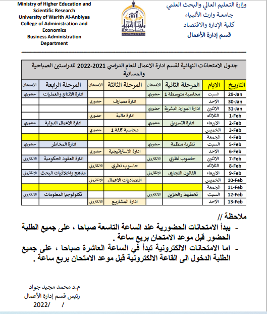 1. يبدأ الامتحان الالكتروني عند الساعة (10:00 صباحا) وينتهي الامتحان بشكل تلقائي عند الساعة (12:00 ظهرا) او كما مثبت في اعدادات الامتحان، علما بانه يوجد عداد وقت تنازلي يظهر امام الطالب طيلة فترة الامتحان.2. على جميع الطلبة استخدام صورهم الشخصية الرسمية (كما في المعاملات) ولا تحتسب اجابة الطالب ما لم يغير صورته الشخصية في الايميل الرسمي.3. يجب على الطالب التحقق ارتداء الزي الرسمي والدخول الى غرفة البث المباشر قبل بدء الامتحان بـ 20 دقيقة وتهيئة الهوية الجامعية وقد يطلب منك المراقب فتح الكاميرا وإبراز الهوية الجامعية.4. يحق للطالب الدخول الى القاعة الامتحانية الافتراضية، في اول 15 دقيقة من بدء التوقيت الفعلي للامتحان، ولا يعتد بنتيجة الطالب إذا كان دخوله للقاعة بعد انقضاء مدة 30 دقيقة من التوقيت الرسمي للامتحان.5. يتم اعتماد المتصفح وليس التطبيق للدخول الى نظام موودل، لكون التطبيق قد تم إيقافه بالكامل تجنبا للمشاكل التي تصاحب انقطاع التيار الكهربائي.6. يسمح للطالب بأداء الامتحان لمرة واحدة فقط، وفي حال انقطاع الانترنت فيمكن للطالب العودة الى الامتحان بمجرد إعادة تسجيل الدخول من جديد طالما ان وقت الامتحان لم ينتهي والاجابة لم تسلم بعد.7. التأكد من الإجابة قبل الانتقال إلى السؤال اللاحق لكون الأسئلة باتجاه واحد وفق متطلبات نزاهة الامتحانات الالكترونية.8. يعد الطالب الذي لم يشترك في الامتحان بدون عذر رسمي راسبا في تلك المادة.9. عندما يطلب من الطالب فتح الكاميرا فيجب عليه فتح الكاميرا مباشرة واي نوع من الامتناع او التلكؤ تعد محاولة غش من الطالب اثناء الامتحان.10. إذا ثبت غش الطالب سيتم اعتباره راسبا للعام الدراسي 2021-2022 استنادا الى المادة 22 من التعليمات الامتحانية النافذة.11. من أجل تجنب قطع الامتحان في حالة استخدام جهاز الموبايل بسبب ورود اتصال مكالمات او رسائل واردة للجهاز، ينبغي تفعيل وضع الطيران ثم تشغيل Wi-Fi، وفي حالة استخدام شبكة السيم كارت يجب حجب (بلوك) جميع جهات الاتصال تجنبا لمنع انقطاع الامتحان.12. في حال التعرض لمشاكل فنية اثناء الامتحان الاتصال بالكلية عن طريق الايميل الساخن ([email protected]) او رقم الموبايل الخاص باللجنة الامتحانية 07725977275.