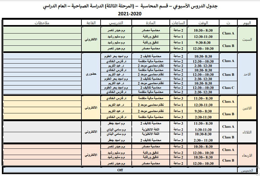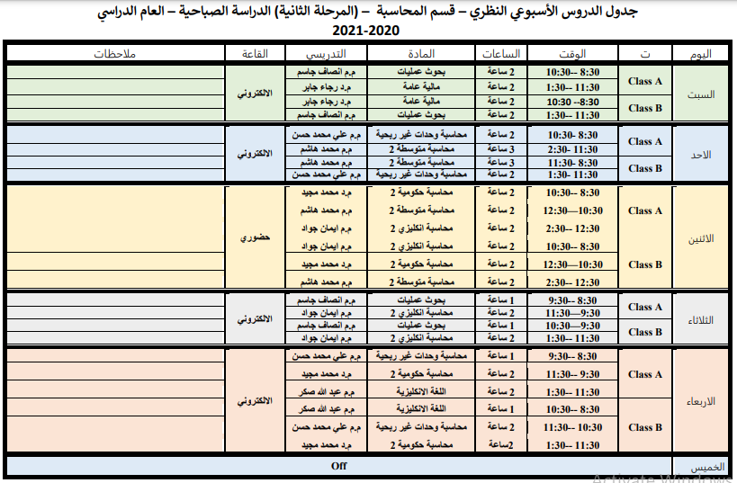جدول الدروس الاسبوعي للكورس الثاني لقسم المحاسبة الدراسة الصباحية