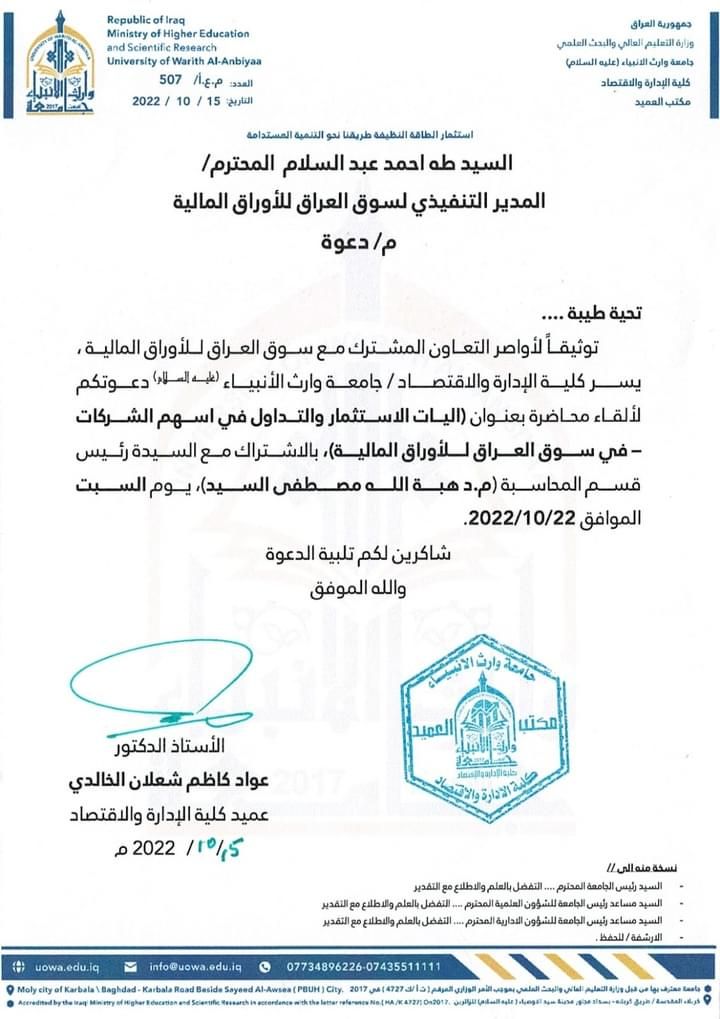 تسر عمادة كلية الادارة والاقتصاد /قسم المحاسبة ، ان تعلن عن نشاط علمي جديد يضيف الاضواء الى سماء كليتنا ،وذلك من خلال استضافه احد اعلام اسواق المال وهو (المدير التنفيذي لسوق العراق للاوراق المالية الاستاذ الخبير طه عبد السلام) وذلك في يوم السبت المصادف ٢٠٢٢/١٠/٢٢ لالقاء محاضره مشتركة مع الدكتورة هبة الله مصطفى السيد بعنوان (آليات الاستثمار والتداول في اسهم الشركات في سوق العراق للأوراق المالية) لذلك نسترعي الانتباه واهلا وسهلا بكم