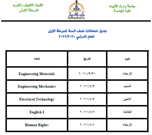 1. تبدأ الامتحانات بتاريخ (20 / 3) للمراحل الثانية والثالثة والرابعة والمرحلة الأولى ستكون بتاريخ (31 / 3) في الساعة 10 صباحاً.