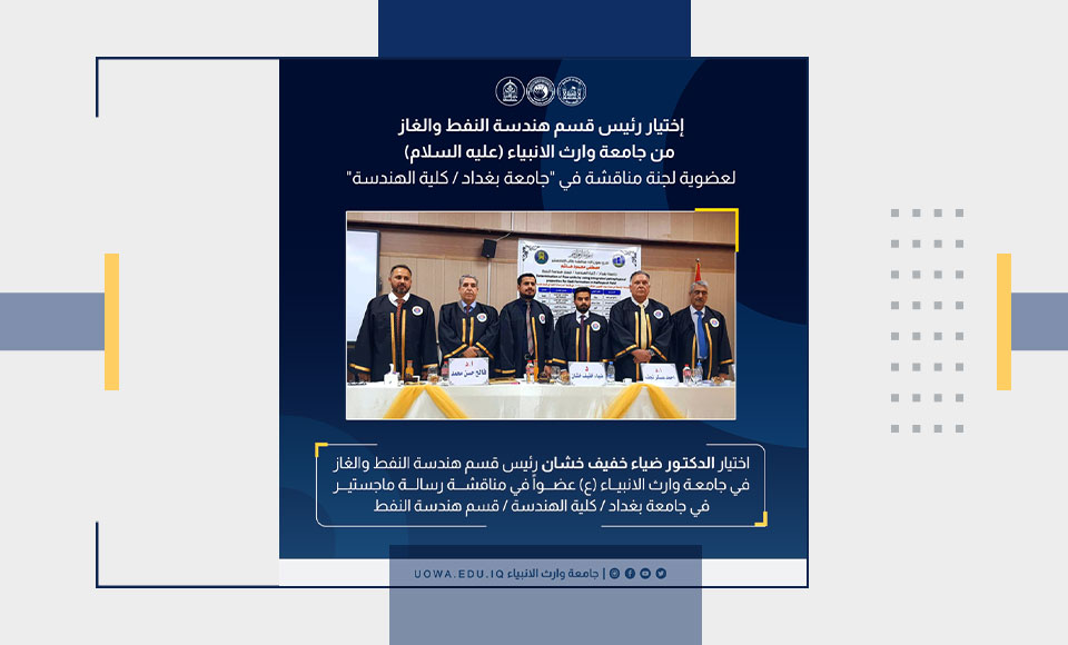 تم اختيار الدكتور ضياء خفيف خشان، رئيس قسم هندسة النفط والغاز في كلية الهندسة، عضواً في لجنة مناقشة رسالة ماجستير لأحد طلبة الدراسات العليا في جامعة بغداد. يأتي هذا الاختيار تقديراً لخبرته الواسعة في مجال النفط والغاز، مما يسهم في تعزيز جودة النقاش الأكاديمي ودعم البحث العلمي المتخصص.