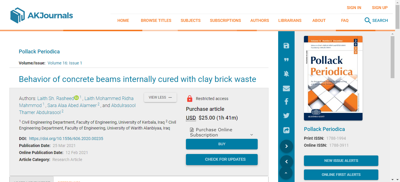 نشر الباحثين والتدريسيين في قسم الهندسة المدنية في جامعة وارث الأنبياء (عليه السلام) م.م. ساره علاء عبدالامير و م.م. عبدالرسول ثامر عبدالرسول بالاشتراك مع فريق بحثي مكون من التدريسيين في كُلْيَة الهندسة في جامعة كربلاء أ.م.د. ليث شاكر رشيد عميد كُلْيَة الهندسة و أ.م.م. ليث محمد رضا بحثاً علمياً باسم جامعة وارث الأنبياء (عليه السلام) بعنوان: