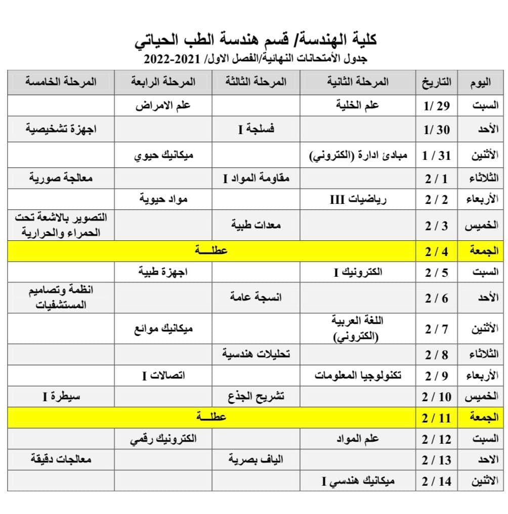 جدول الامتحانات النهائية للفصل الاول لقسم هندسة الطب الحياتي و خارطة توزيع الطلاب في القاعات