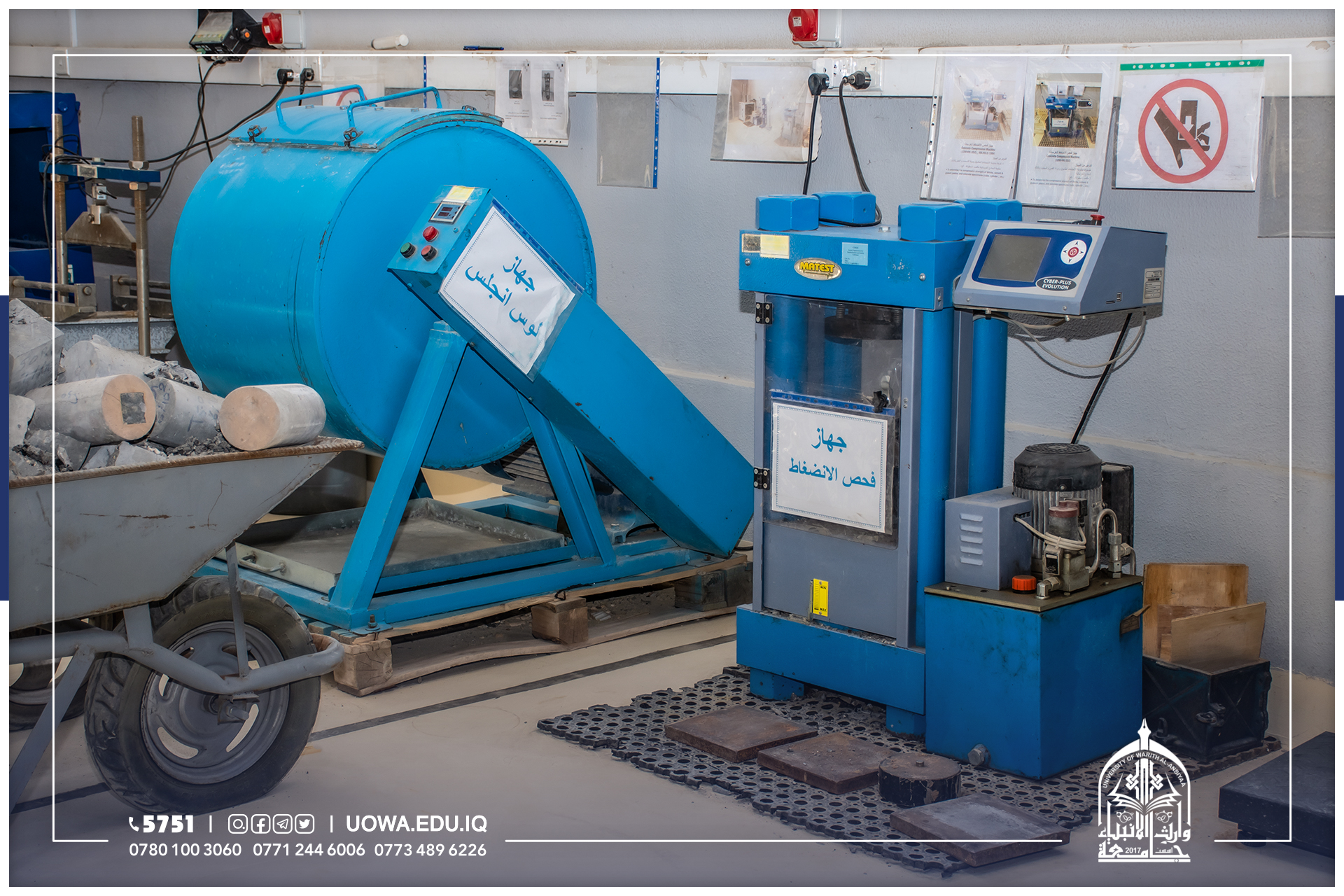 يعنى هذا المختبر بأجراء الفحوصات المختبرية للمواد الانشائية وكذلك الفحوصات المختبرية للإسمنت والمواد الخرسانية والركام (الرمل والحصى) وهذه الفحوصات ضرورية جدا لتمكن الطالب من معرفة كيفية خلط المواد مع بعضها البعض وبنسب معينه ودقيقه ومعرفة المشاكل التي تواجهه في حال لم يتم خلط المواد وفقا للنسب المحددة والظروف القياسية الملائمة التي تؤدي الى نجاح او فشل العينة ومدى مطابقتها للمواصفات الفنية من عدمه بالإضافة الى ذلك تمنح الفحوصات المختبرية دورا مهما يمكن المهندس من معرفة المادة الانشائية الجيدة وتمييزها والتي تؤدي الى زيادة عمر المنشأ