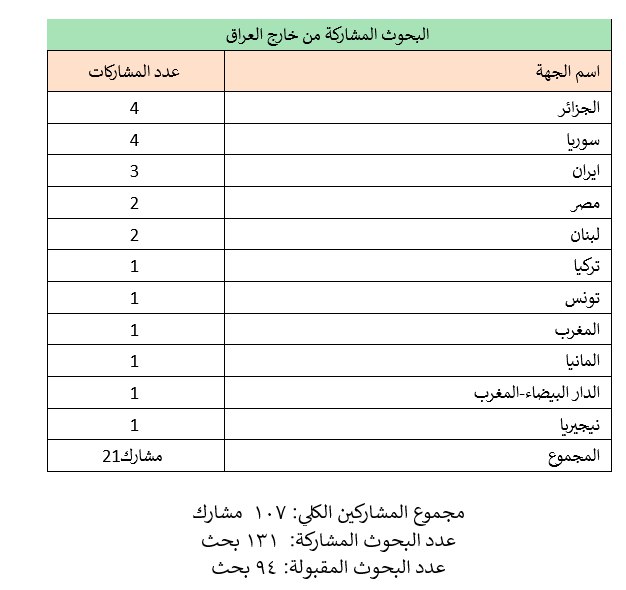 تضمن التقرير إشادة بالجهود التي بذلتها مختلف الجهات الأكاديمية والعلمية من داخل العراق وخارجه. شاركت في المؤتمر 21 بحثاً من 9 دول مختلفة، شملت مصر، سوريا، لبنان، تركيا، المغرب، تونس، ألمانيا، نيجيريا، والجزائر، إضافة إلى 85 بحثاً من جميع أنحاء العراق، من السليمانية إلى البصرة.