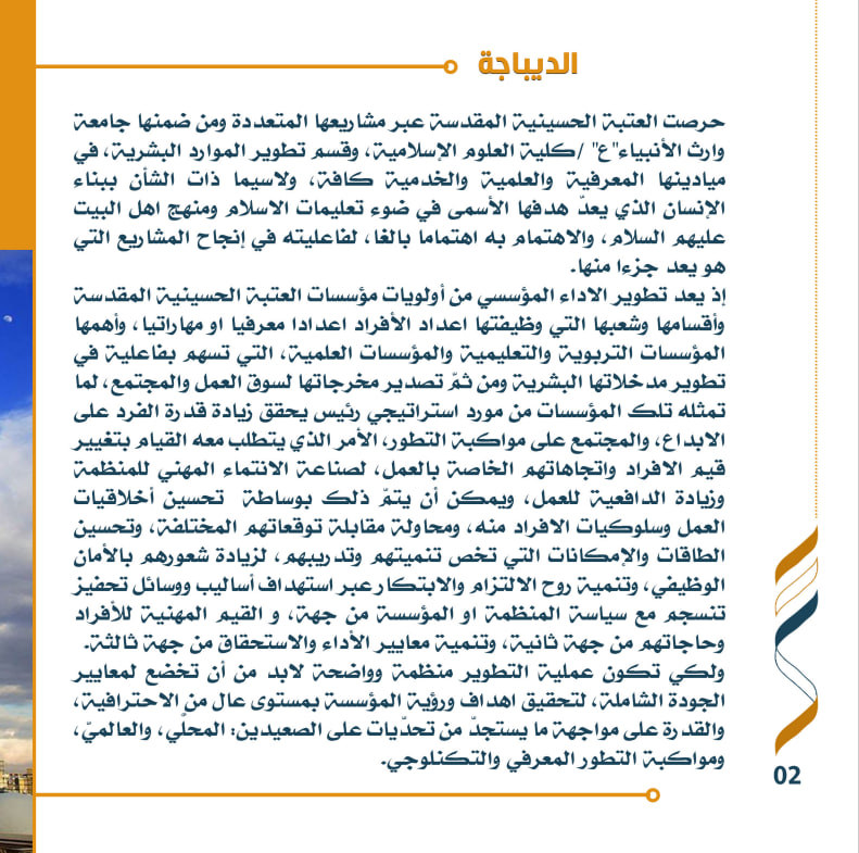 في إطار الجهود المستمرة لتعزيز الجودة وتطوير الأداء المؤسسي، تنظم العتبة الحسينية المقدسة مؤتمرها الثاني بعنوان "بالتنمية والتطوير نرتقي". تحت عنوان "فاعلية الجودة في تطوير الأداء المؤسسي"، بالتعاون مع جامعة وارث الأنبياء، وكلية العلوم الإسلامية، وقسم تطوير الموارد البشرية.