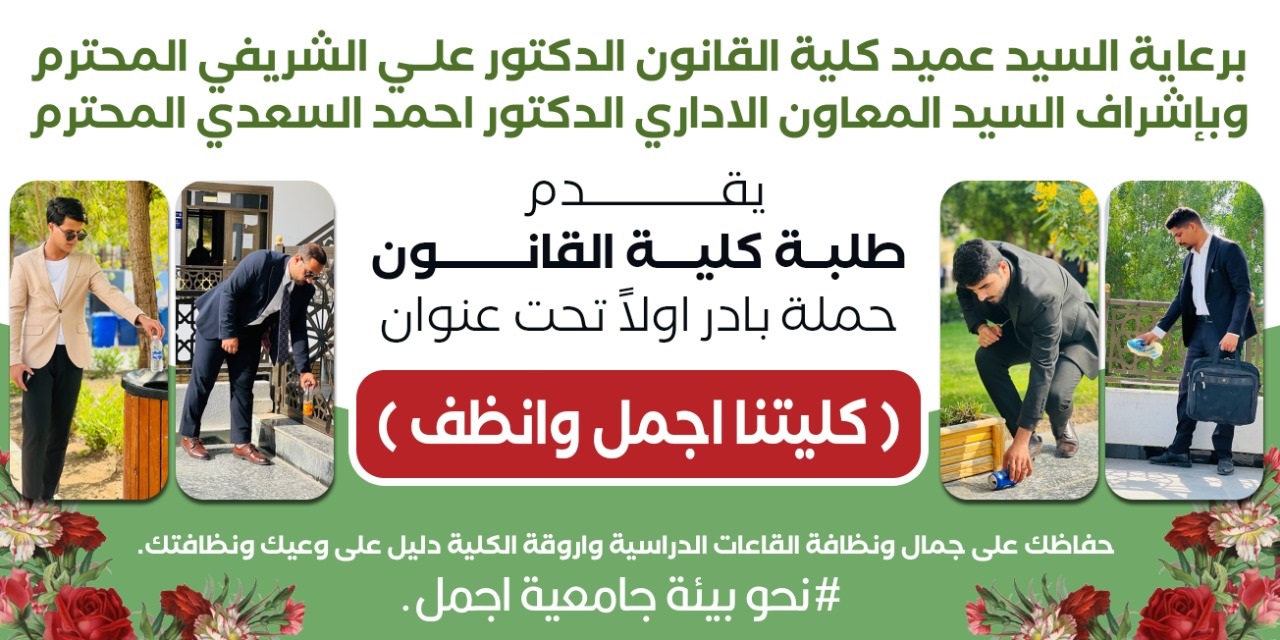 نفذ طلبة كلية القانون باشراف السيد عميد كلية القانون ا.م.د. علي صاحب الشريفي و السيد المعاون الاداري م.د. احمد صبري كاظم نشاط طلابي بعنوان بادر اولا نحو بيئة جامعية اجمل يهدف إلى تحسين البيئة الجامعية وجعلها أنظف، فهذا يعد خطوة رائعة نحو تعزيز الوعي البيئي بين الطلاب والمساهمة في تحسين الحرم الجامعي.