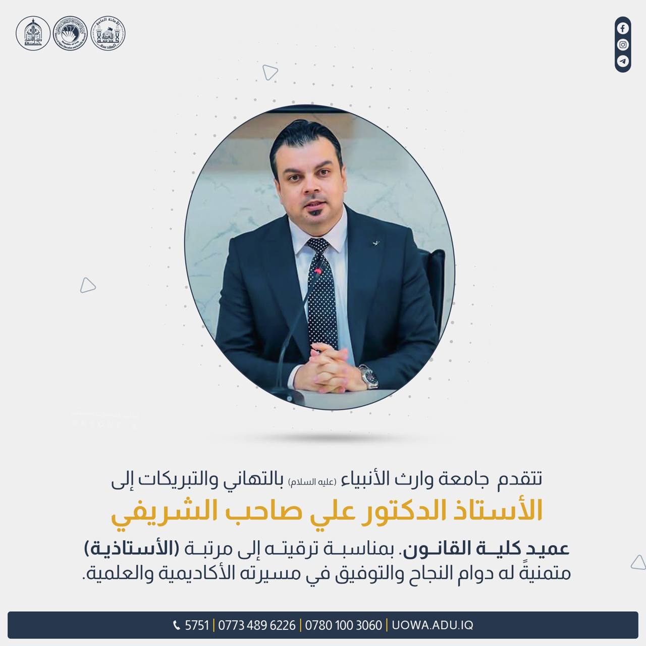 نهنئ عمادة كلية القانون أ.د. على صاحب الشريفي لحصوله على لقب "أستاذ دكتور"، وهو إنجاز علمي كبير يعكس تفوقه وإسهاماته المستمرة في مجال التعليم والبحث العلمي، إن هذا التكريم هو نتيجة سنوات من الجهد والتميز في مجال الأكاديمي، ونتمنى له المزيد من التقدم والنجاح في مسيرته العلمية والعملية.