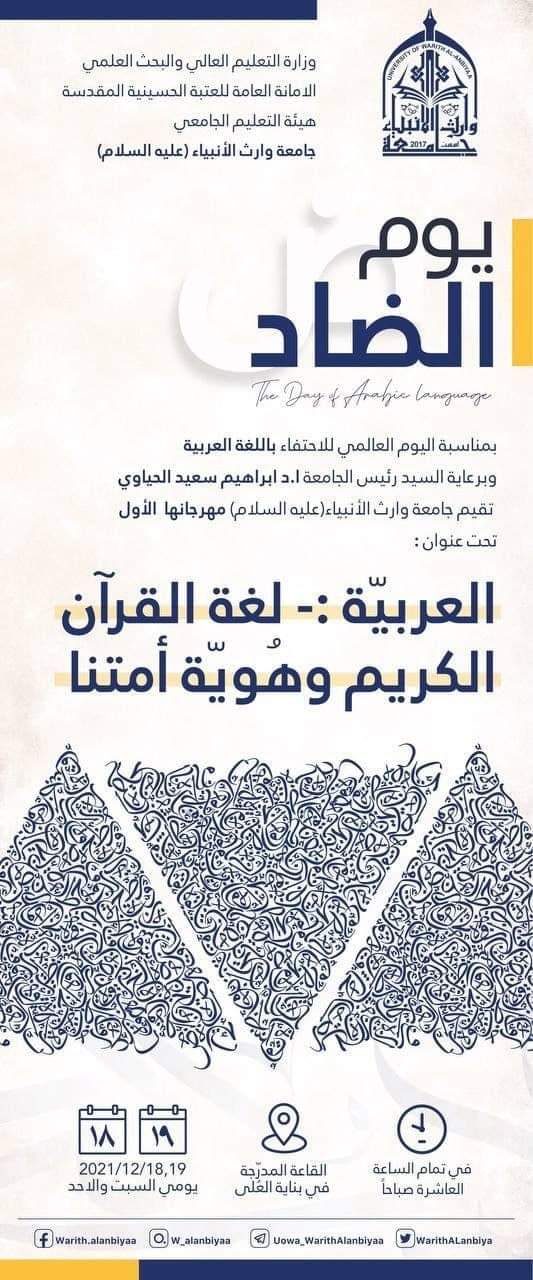 بمناسبة اليوم العالمي للغة العربية ،وبحضور السيد رئيس هيئة التعليم الجامعي الاستاذ الدكتور حيدر التميمي ،وبرعاية السيد رئيس الجامعة الاستاذ الدكتور ابراهيم الحياوي. اقامت جامعة وارث الانبياء(عليه السلام) ،وبالتعاون مع كليتي العلوم الإسلامية وكلية القانون مهرجانها الاولتحت عنوان( العربية:-لغة القرآن الكريم وهوية أمتنا) الذي يستمر لمدة يومين بحضور نوعي وكمي لأساتذة اللغة العربية والمهتمين بها والطلبة،حيث شهد المهرجان في يومه الاول ،طرح ورقتين بحثيتين لإثنين من كبار الباحثين في اللغة ،لبيان اهميتها ومفاصلها باعتبارها هوية امة من الواجب التمسك والاعتزاز بها.