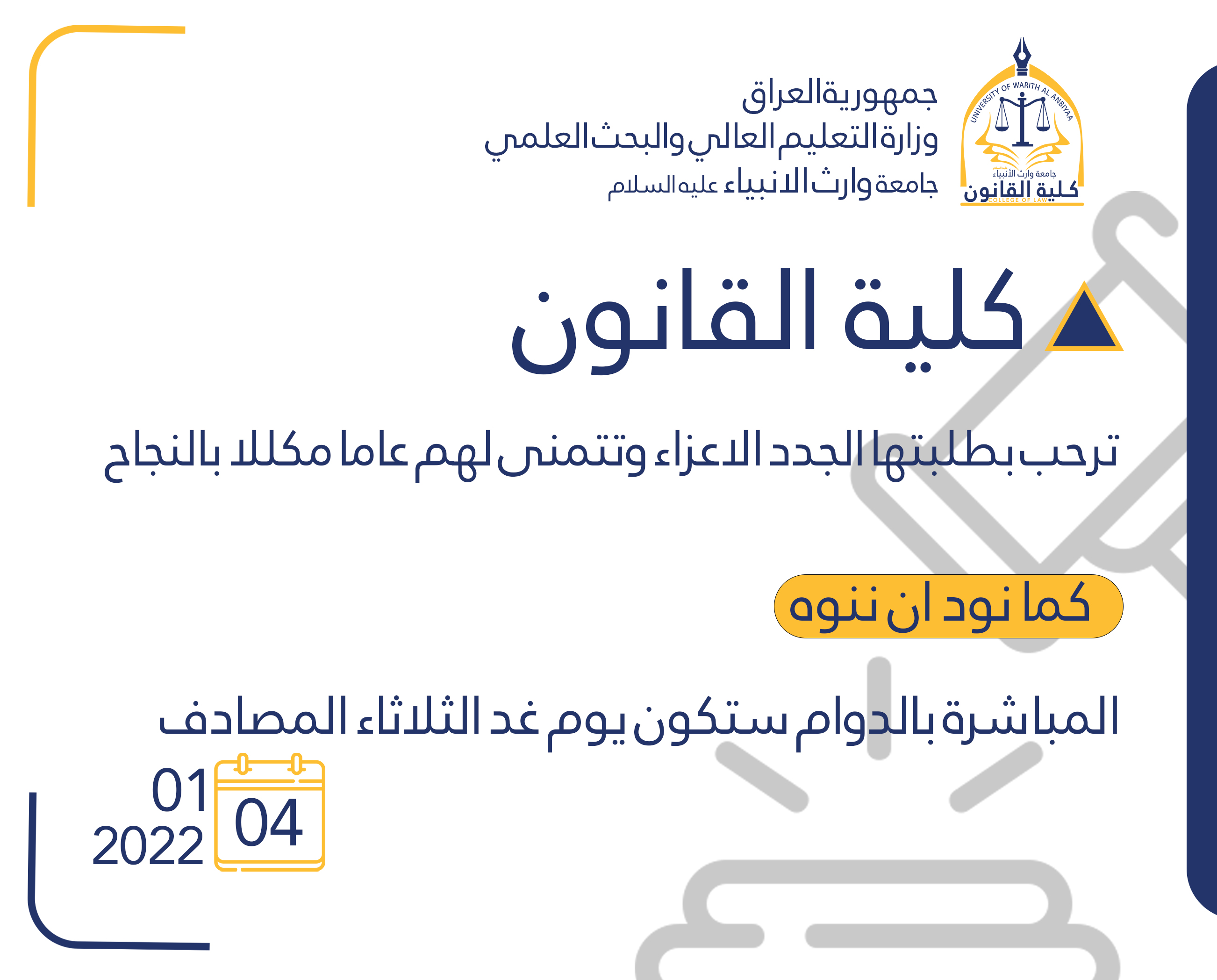كما نود التنويه ان موعد المباشرة بالدوام سيكون من يوم غد الثلاثاء المصادف 2022\01\04