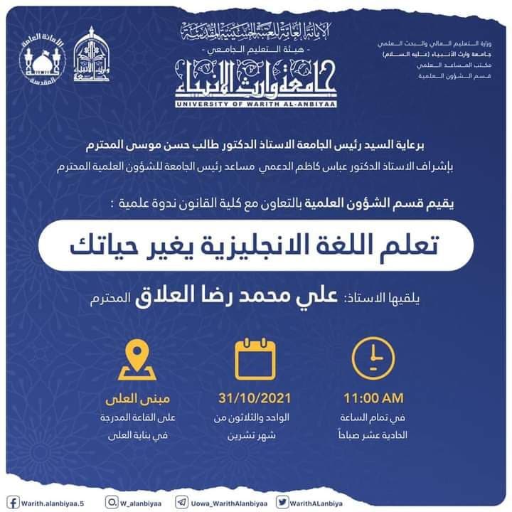 اقامت  كلية القانون بالتعاون مع قسم الشؤون العلمية ورشة علمية بعنوان تعلم اللغة الانجليزية يغير حياتك ،يوم الأحد المصادف ٢٠٢١/١٠/٣١.
