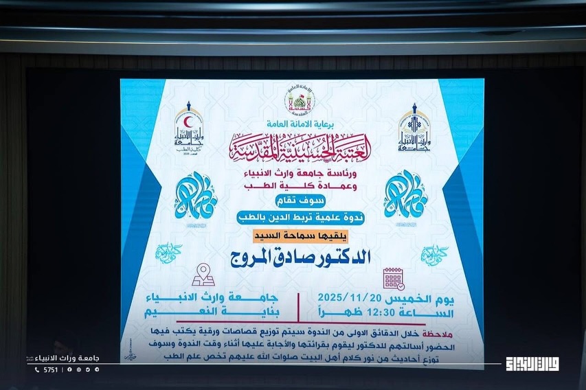 برعاية الأمانة العامة للعتبة الحسينية المقدسة، نظّمت كلية الطب في جامعة وارث الأنبياء ندوة علمية بعنوان "ارتباط الدين بالطب" قدّمها السيد الدكتور صادق المروج، بحضور جمع من طلبة الكلية وأساتذتها.وتناولت الندوة محاور عدّة، أبرزها كيفية ربط القرآن الكريم بالعلم، وبيان تأثير القرآن على طالب العلم في الجانبين الأخلاقي والمعرفي، إضافة إلى بحث العلاقة بين التعاليم الدينية والمفاهيم الطبية الحديثة.وفي مستهل الندوة، جُمعت أسئلة الحضور عبر قصاصات ورقية ليتم الإجابة عنها أثناء الجلسة، كما شهدت الفعالية توزيع أحاديث من كلام أهل البيت عليهم السلام مرتبطة بالطب، بهدف تعزيز البعد القيمي والإنساني في الممارسة الطبية.