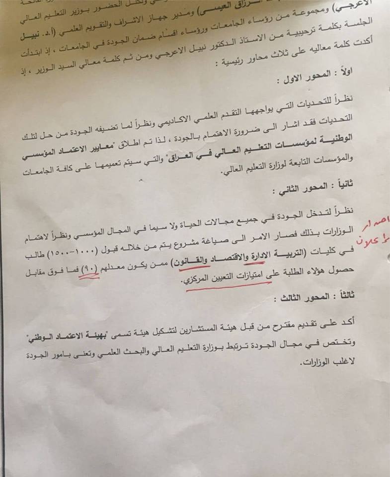 بناءا على مقترح وزارة التعليم العالي والبحث العلمي لخطة قبول الطلبة من ذوي المعدلات (90%) فما فوق فقد قرر مجلس الوزراء اعتماد خطة الموارد البشرية في حقل العلوم الادارية والاقتصادية والمالية والقانونية الواردة في كتاب  وزارة التعليم العالي والبحث العلمي ذي العدد: م.و 1/632 والمؤرخ 24/4/2018 وبحسب الاتي: 1.قبول الطلبة من ذوي المعدلات (90%) فما فوق من خريجي الدراسة الاعدادية/الفرع العلمي (تطبيقي, احيائي) في كليات الادارة والاقتصاد ضمن أقسام (ادارة الاعمال , الاحصاء, الادارة العامة, الادارة الصناعية, المحاسبة ,الاقتصاد, العلوم المالية والمصرفية). 2.قبول الطلبة من ذوي المعدلات (90%) فما فوق من خريجي الدراسة الاعدادية الفرعين(العلمي/تطبيقي أحيائي) والادبي في كليات: القانون والتربية الاساسية بأختصاصاتها كافة ضمن خطة (1000) مقعد على وفق تنوع التعليم.وقد جاء القرار على ضوء أهمية تهيئة نخبة من طلبة الدراسية الاعدادية بخطة شمولهم ضمن القبول المركزي وصولا الى بناء أجيال جديدة تحمل لواء العلم والمعرفة في المجتمع العراقي. علما أن صياغة المشروع يتم من خلاله قبول (1000-1500) طالب في كليات (التربية الادارة والاقتصاد والقانون) ممن يكون معدلهم (90) فمافوق مقابل حصول هؤلاء الطلبة على امتيازات التعيين المركزي.