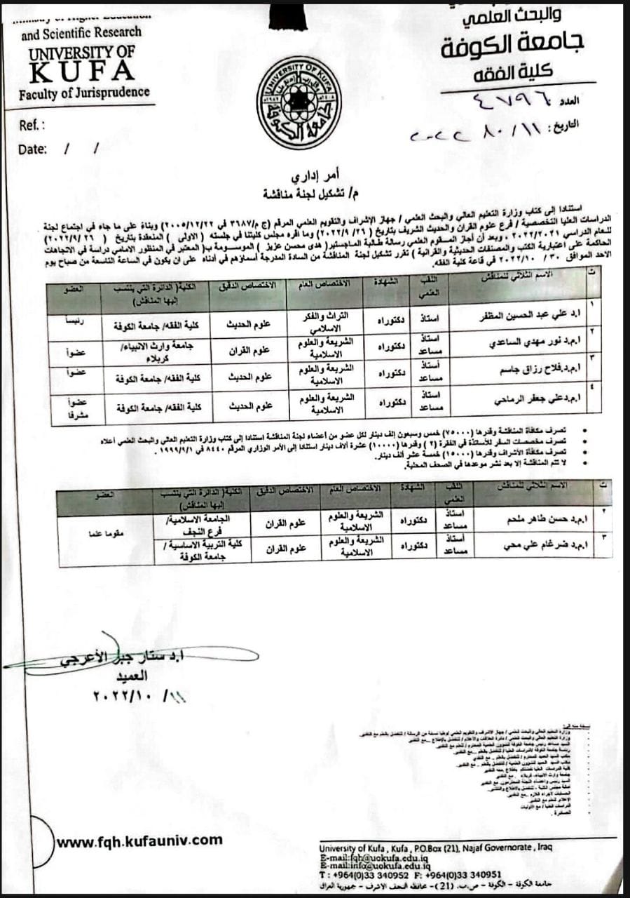 شارك الاستاذ المساعد الدكتور طلال فائق الكمالي في عضويه ومناقشة اطروحة الدكتوراه للطالبة إسراء شاكر جوده الخفاجي لإطروحتها الموسومة تحت عنوان :  (البحث القرآني في كتاب بحار الانوار - دراسة تحليلية-) وبحضور عميد الكلية الاستاذ الدكتور ستار جبر الأعرجي وذلك في يوم الاثنين الموافق ٣١/١٠/٢٠٢٢ على قاعة مناقشات كلية الفقه جامعة الكوفة.إذ تألفت لجنة المناقشة من السادة الافاضل : ١. أ.د جاسم محمد علي الغرابي  .................... رئيساً ٢. أ.المتمرس د. صالح جبار القريشي...............عضواً ٣. أ.د عدي جواد الحجار .................. ...........عضواً ٤. أ.م.د طلال فائق الكمالي  .........................عضواً