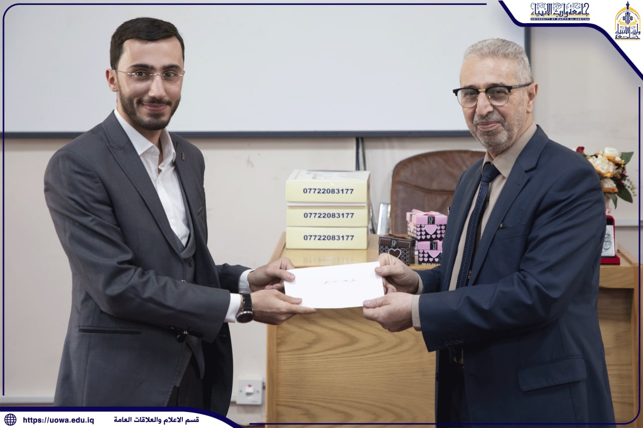 وفي نهاية الورشة تم تكريم الاستاذ علي محمد رضا على ما قدمه من معلومات قيمه باسلوب ممتع ،من قبل رئاسة جامعتنا متمثلة بالسيد عميد كلية القانون الاستاذ المساعد الدكتور عدنان جواد هاشم الشروفي  .