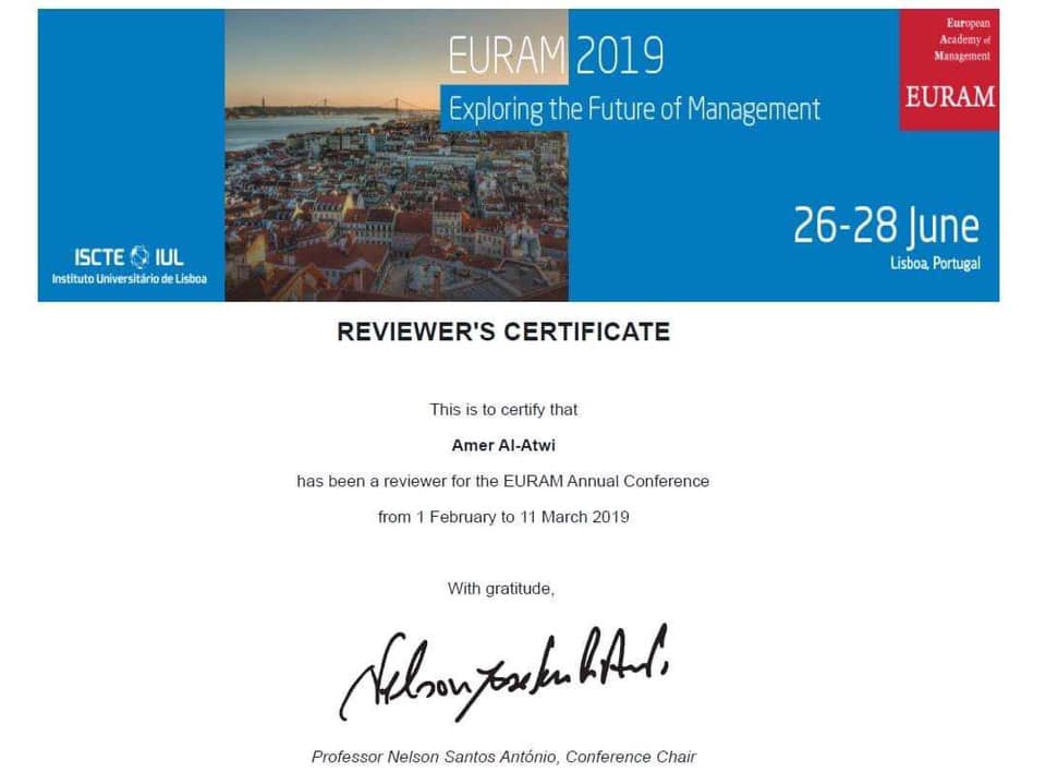 حصول السيد عميد الكلية على شهادة تقديرية من قبل مؤتمر اكاديمة الاوربية للادارة لقيامه بعمل التقيم في فعاليات هذا المؤتمر