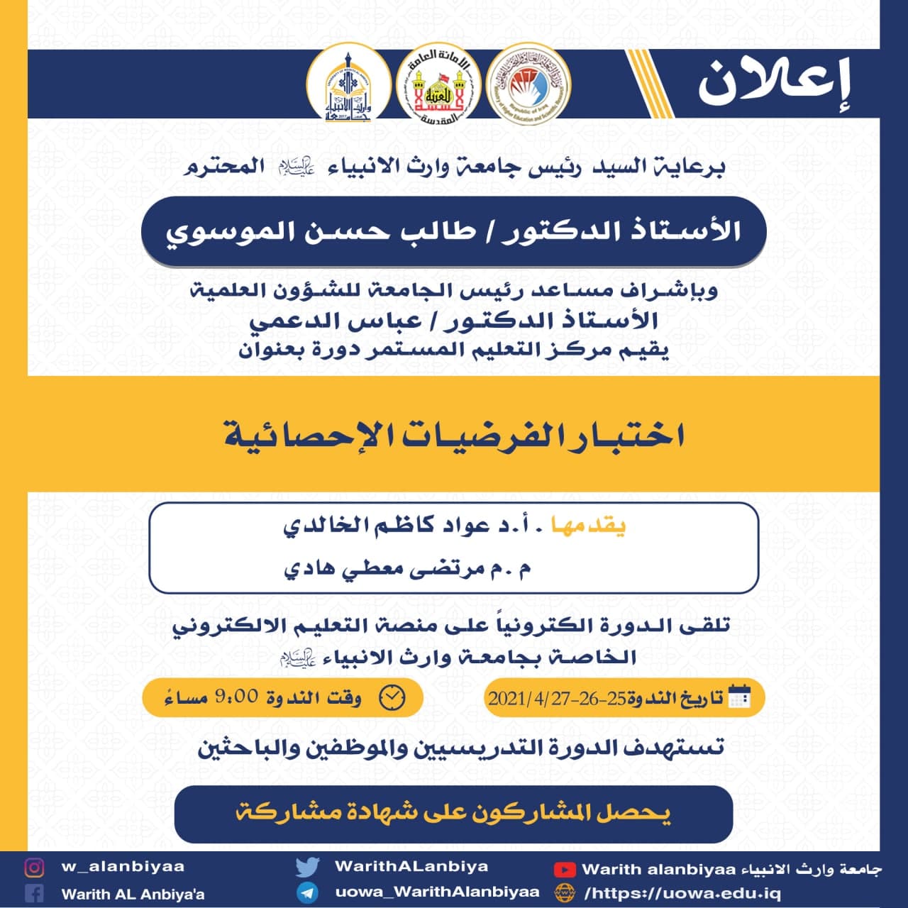 يقيم مركز التعليم المستمر في جامعة وارث الانبياء(عليه السلام) ندوة علمية إلكترونية