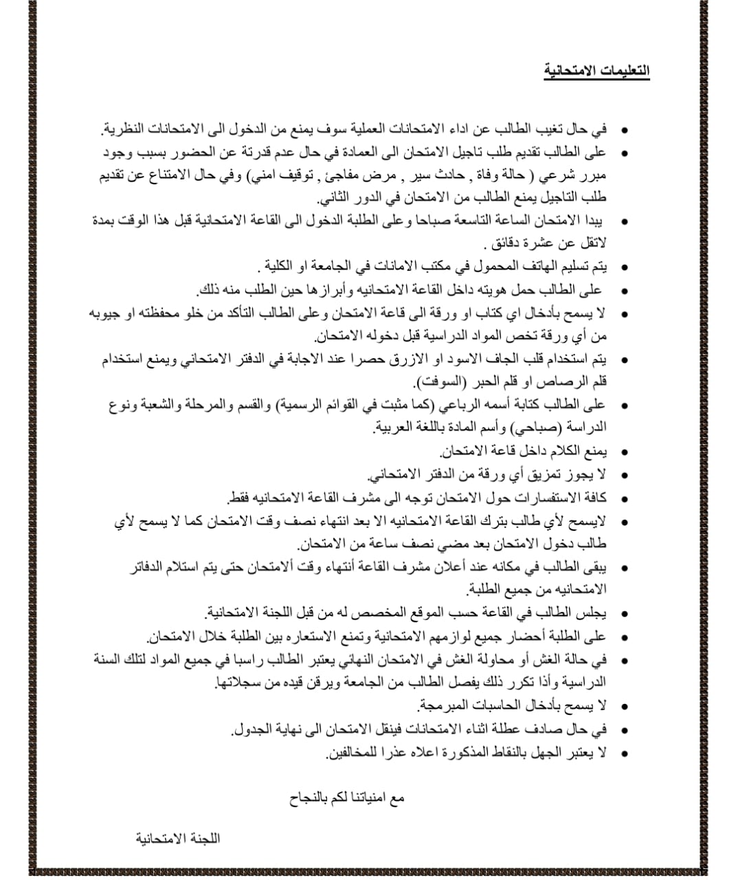 التعليمات الامتحانية لامتحانات الفصل الدراسي الثاني للعام الدراسي ( 2023 - 2024 ) / الدور الاول