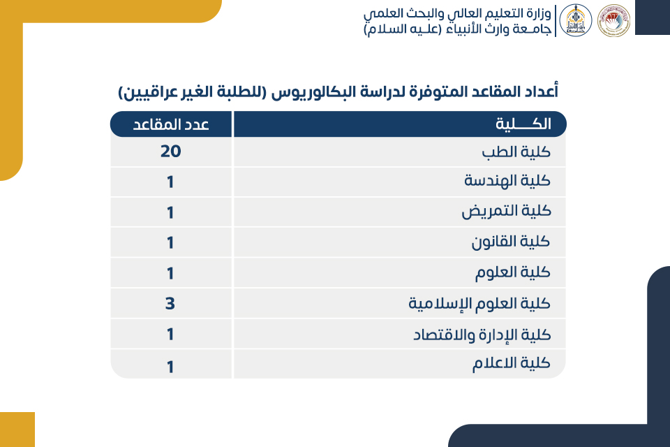 يسرّ جامعة وارث الأنبياء (عليه السلام) أن تعلن عن توفر (29) منحة دراسية ممولة بالكامل لبرامج البكالوريوس في التخصصات التالية: