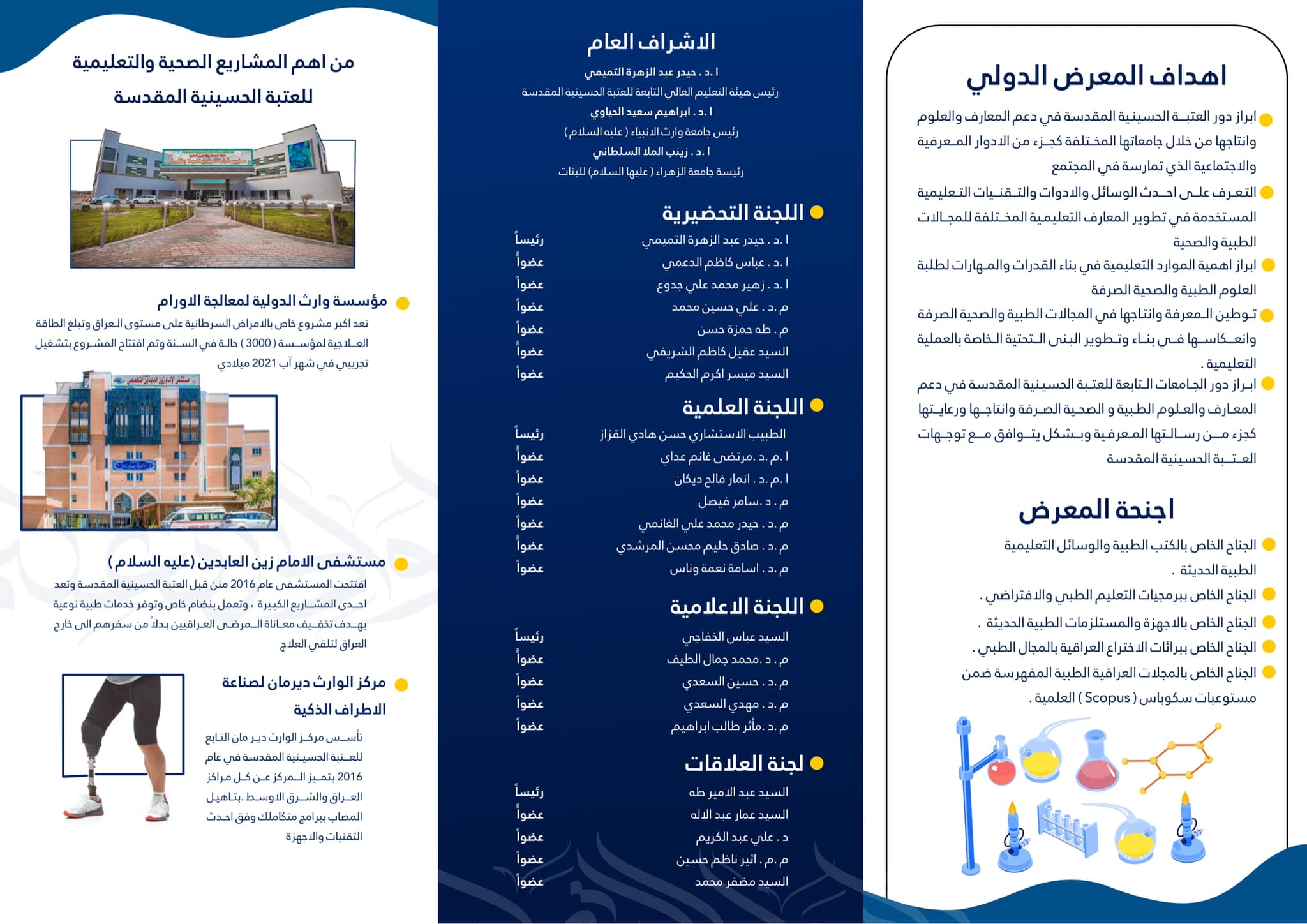 برعاية وزارة التعليم العالي والبحث العلمي وبإشراف الامانة العامة للعتبة الحسينية المقدسةهيئة التعليم الجامعيتدعو جامعتي وارث الانبياء (عليها السلام) والزهراء(عليها السلام) للبنات،كل من الجامعات الحكومية والاهلية كافة، المراكز البحثية والتخصصية الطبية، شركات الاجهزة الطبية، شركات الاجهزة والمستلزمات الطبية، شركات برمجيات التعليم الطبي، دور النشر المتخصصه بالكتب الطبية والمفهرسة ضمن المستوعبات العالمية، المحاضرين الباحثين، العلماء البارزين و المتخصصين من الشركات الطبية.لحضور( المعرض الدولي للموارد التعليمية الطبية الحديثة ) تحت شعار "كربلاء بوصلة العراق الطبية"الذي تقيمه الامانة العامة للعتبة الحسينية المقدسة للفترة من 7-11 \ 5\2022للمزيد من المعلومات الرجاء الدخول على الرابط ادناه:http://iemmer.com/