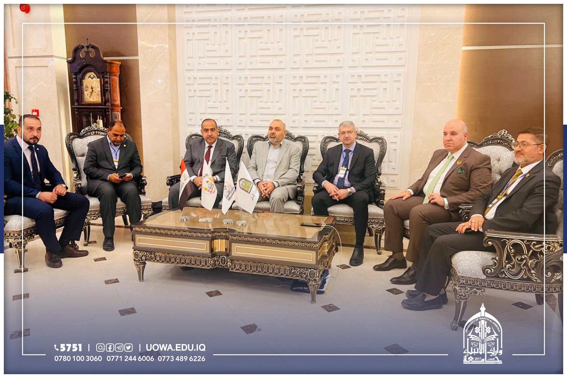 التقى المتولي الشرعي للعتبة الحسينية المقدسة سماحة الشيخ عبد المهدي الكربلائي (دام عزه) بطلبة جامعة وارث الانبياء(عليه السلام) المبتعثين الى مصر وايران، بحضور السيد رئيس الجامعة الاستاذ الدكتور ابراهيم الحياوي، والسيد مدير مركز التعليم المستمر الدكتور حيدر الغانمي والسيد مدير قسم النشاطات الطلابية الدكتور همام عبد العباس.