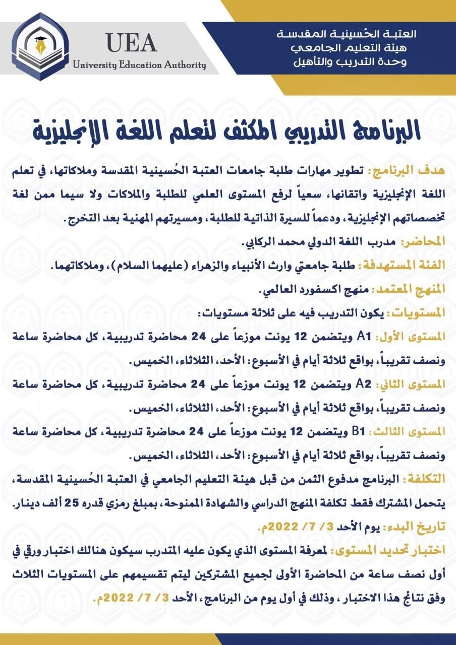 أطلقت هيئةُ التعليم الجامعي في العتبة الحسينية المقدسة برنامجها الأول لتعلم اللغة الانجليزية بمستوياتِها كافة، مستهدفةً بذلك رفع مستوى الكفاءةِ لطلبةِ جامعتي وارث الانبياء والزهراء (عليهما السلام)، علمًا أن البرنامجَ ممولاً ومدعومًا بالكاملِ من الهيئةِ ويشملُ الطلبةَ والملاكاتَ العلميةَ والادارية كما نود إعلامكم ان التسجيل ودفع رسوم الاشتراك يكون في مقر هيئة التعليم الجامعي داخل جامعة وارث الأنبياء (عليه السلام).