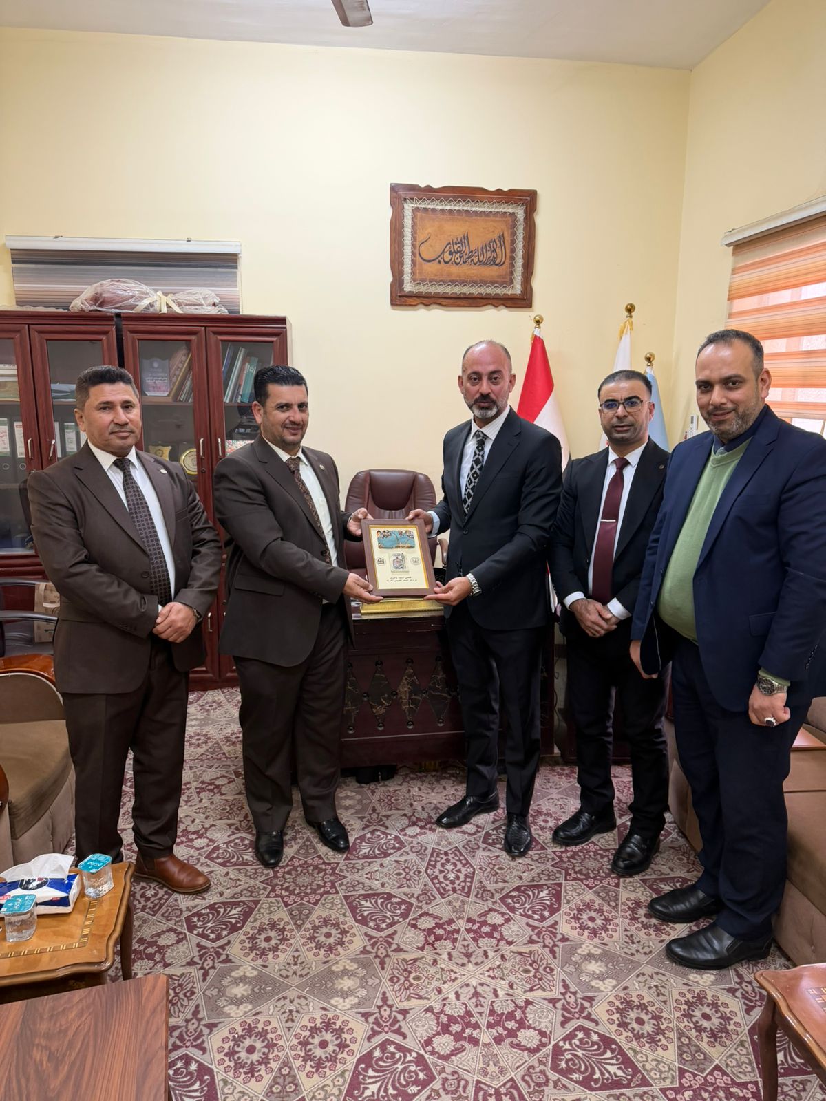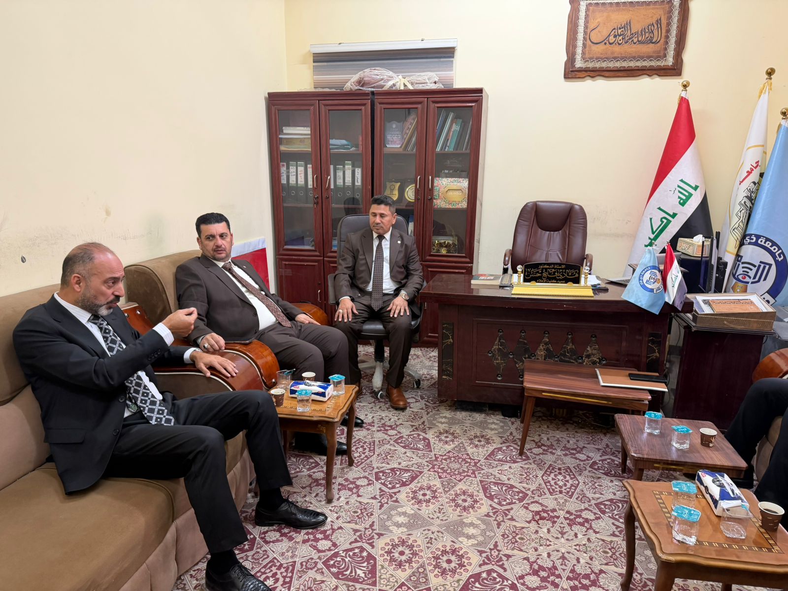 A delegation from the Faculty of Media at Al-Waritheen University, affiliated with the Holy Hussein Shrine, discussed with the deanship of the Faculty of Media at Thi Qar University the latest developments in the field of media, artificial intelligence, and joint evaluation exams