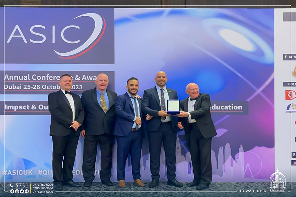 The Director of the Center for Continuing Education, Assistant Professor Dr. Haider Al-Ghanimi, and the Head of the Quality Assurance Department, Assistant Lecturer Hussein Hazim, participated in the international conference organized by the British organization ASIC (Academic and Institutional Accreditation). ASIC is an accreditation body for various international universities, institutes, and other academic institutions. The conference was held under the theme "The Impact and Results of Quality in Global Education." The university was honored with the Excellence Shield for its efforts in supporting students in various areas, including scholarships, discounts, and voluntary work in community service.