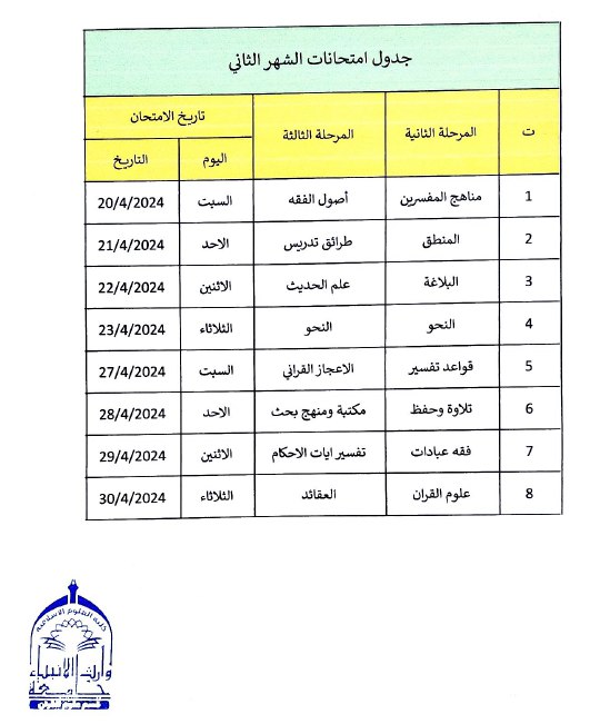 Schedule of second month exams for the second semester of the academic year 2023-2024, Department of Qur’anic Sciences