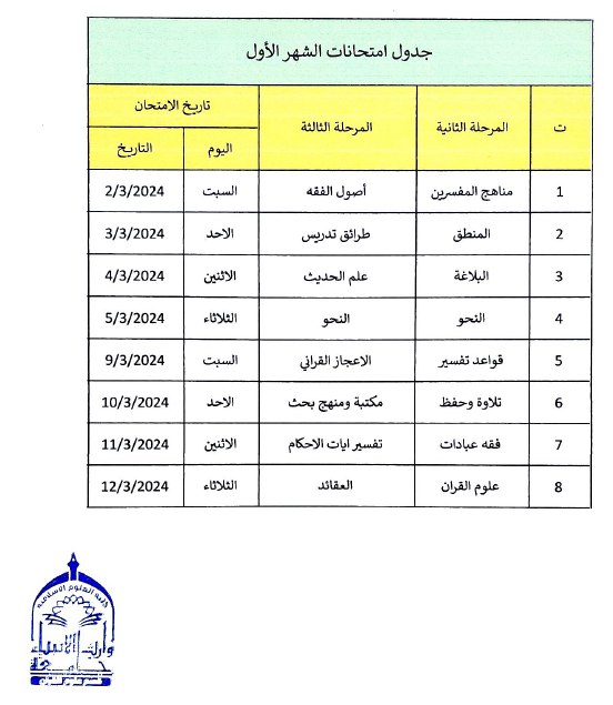 Schedule of exams for the first month of the second semester of the academic year 2023-2024, Department of Qur’anic Sciences