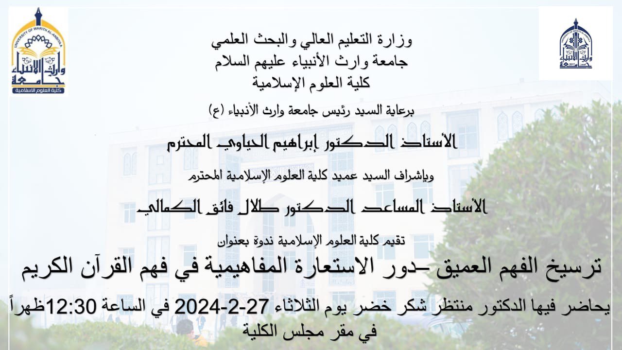 Under the guidance and support of the President of Warith Al-Anbiya University, Professor Dr. Ibrahim Al-Hayawi, and under the supervision of the Dean of the College of Islamic Sciences, Assistant Professor Dr. Talal Faiq Al-Kamali, the College of Islamic Sciences at Warith Al-Anbiya University organized a scientific workshop entitled: “Establishing Deep Understanding - The Role of Conceptual Metaphor in Understanding The Holy Quran".