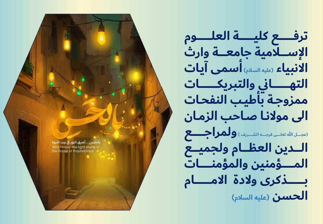 The College of Islamic Sciences at Warith Al-Anbiya University (peace be upon him) extends its warmest congratulations and blessings, filled with the finest expressions of joy, to our Master, the Awaited Imam (may Allah hasten his reappearance), to the esteemed religious authorities, and to all believers on the blessed birth anniversary of Imam Al-Hasan (peace be upon him).