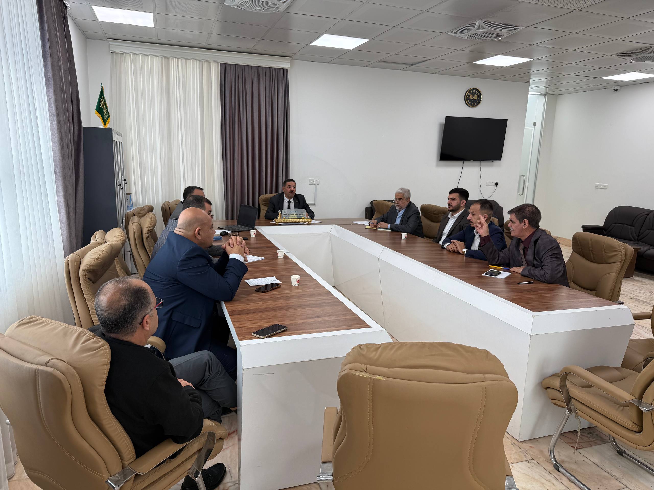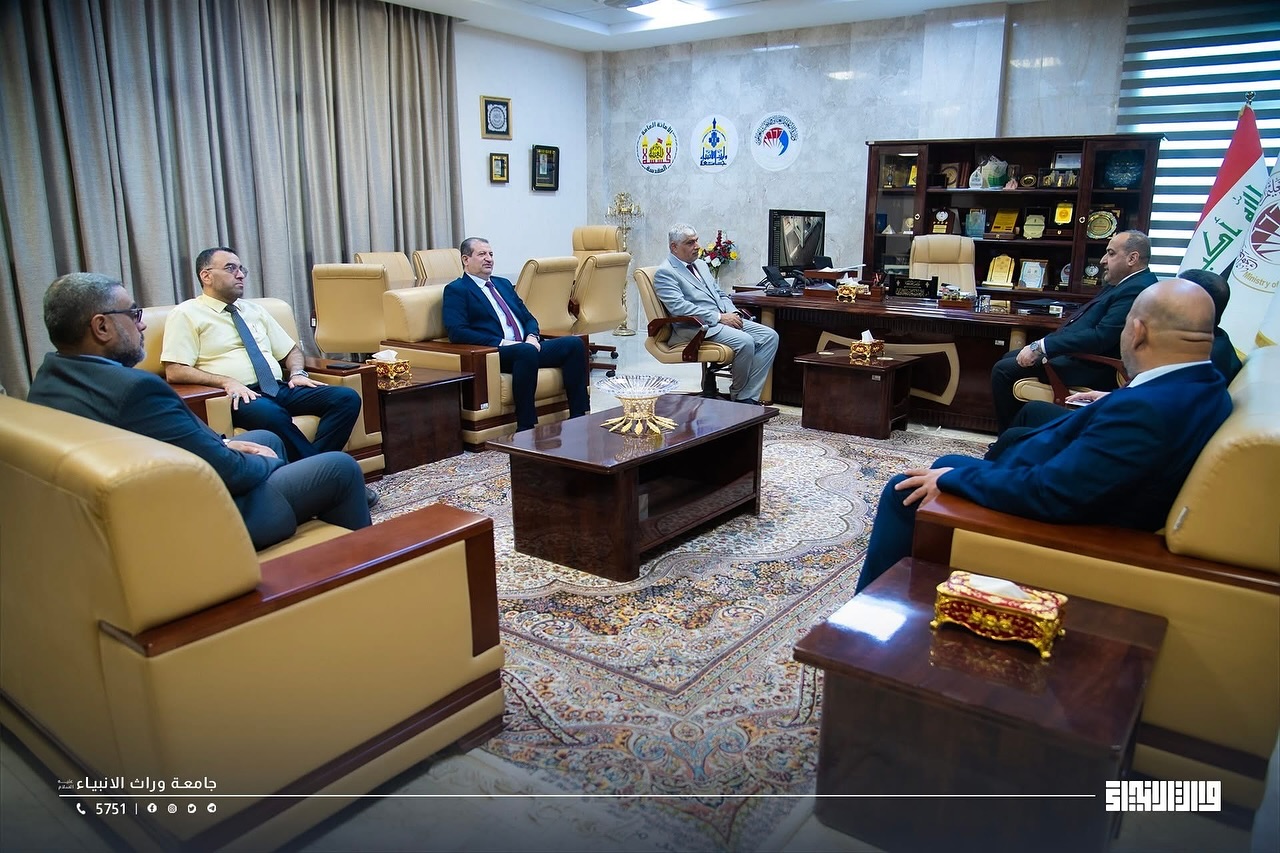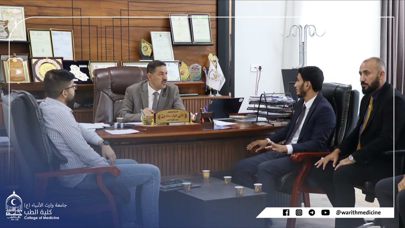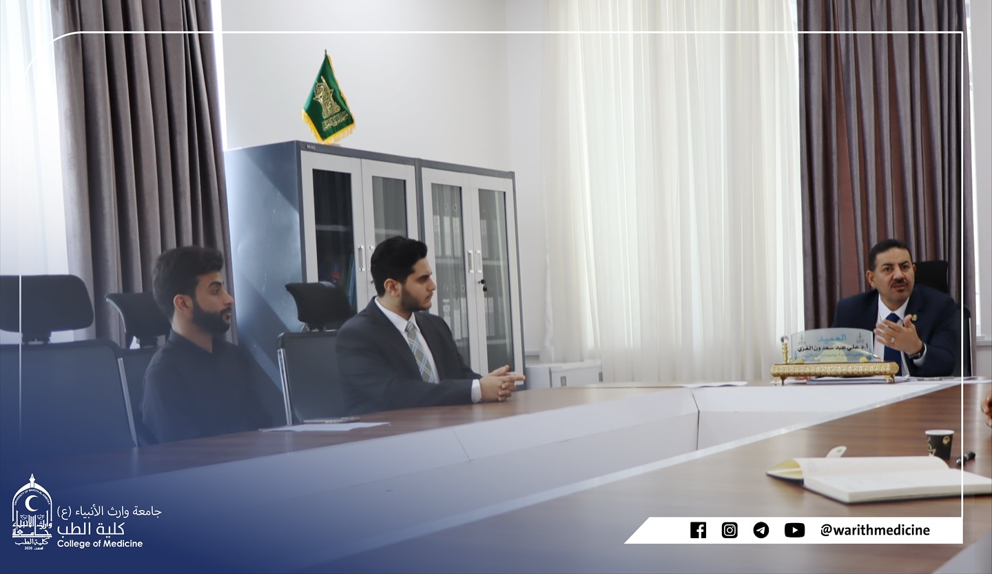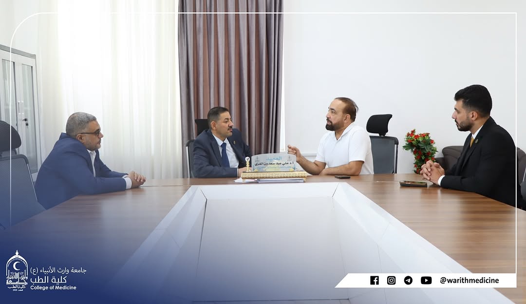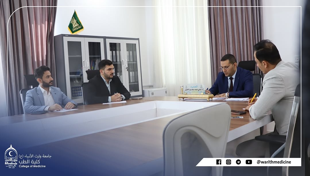 A meeting was held, chaired by Professor Dr. Ali Abdul Saadoun Al-Ghazi, Dean of the College of Medicine at Warith Al-Anbiya University (peace be upon him), with Dr. Mustafa Al-Shafi’i, Director of Al-Hindiya General Hospital. Also present were the Assistant Dean for Administrative Affairs, Dr. Anwar Sadiq Al-Dahhan, and the joint coordination committee from both sides. The meeting focused on discussing mechanisms for developing cooperation in clinical training and summer training for medical students.