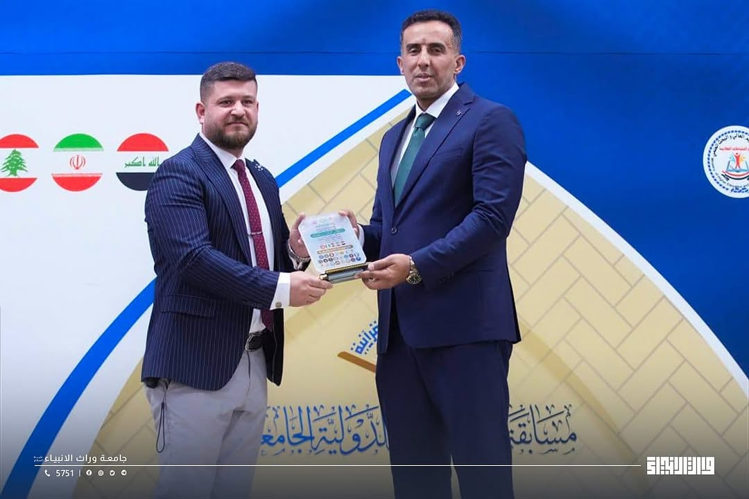 As part of Warith Al-Anbiya University's participation in the Al-Noor International University Quran Competition, organized by the Ministry of Higher Education and Scientific Research, with the participation of 53 Iraqi universities and 6 foreign universities from around the world, student Hafiz Muhammad Hassan Shamran from the College of Medicine won a distinguished award during the competition hosted by Al-Ameed University.