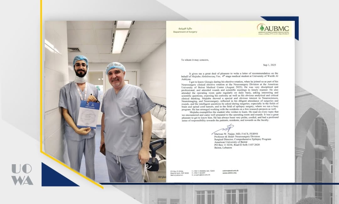 The Faculty of Medicine at Warith Al-Anbiya University (peace be upon him) congratulates student Mujtaba Abdul-Razzaq Yass on completing an intensive 30-day training program in neurosurgery at the American University of Beirut (AUB) and its affiliated hospital, one of the most prestigious medical and academic centers in the region. The program included the student's participation in daily morning and clinical rotations, observing complex surgical procedures, participating in outpatient clinics, and attending lectures and scientific conferences with a select group of faculty members from the department. This achievement is a significant step in our students' journey to enhance their clinical experience and refine their practical skills within world-class educational environments, contributing to raising the profile of Warith Al-Anbiya University (peace be upon him) and the distinction of its students both locally and internationally.