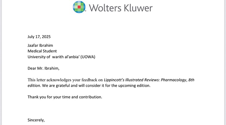 The Dean of the College of Medicine at Warith Al-Anbiya University (PBUH), Professor Dr. Ali Abdul Saadoun Al-Ghazi, honored student Jaafar Ibrahim Dakhil Matar, presenting him with a letter of thanks and appreciation from the University President, Professor Dr. Ibrahim Saeed Al-Hayawi, in addition to a financial reward in recognition of his distinguished scientific efforts. This honor came after the student sent an official letter to the international publishing house, Walters Kluwer, regarding a precise scientific observation in the book *Lippincott’s Illustrated Reviews: Pharmacology – 8th Edition*, concerning the description of MAOIs on pages 141 and 185.