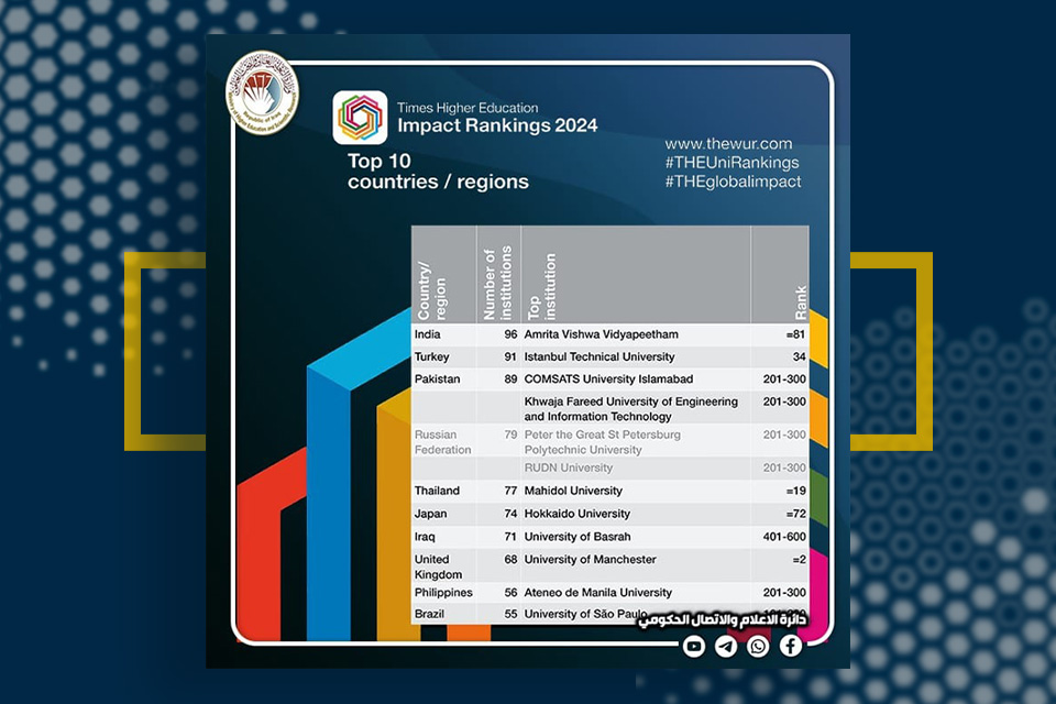 The Ministry of Higher Education and Scientific Research stated that Iraq ranked first in the Arab world and seventh globally in the Times Higher Education Impact Rankings 2024, an accomplishment that speaks to the calibre of university education in the country. The number of Iraqi universities that competed in the 2024 edition of the ranking—which included 2,152 academic institutions from 125 different countries—was the basis for this accolade.